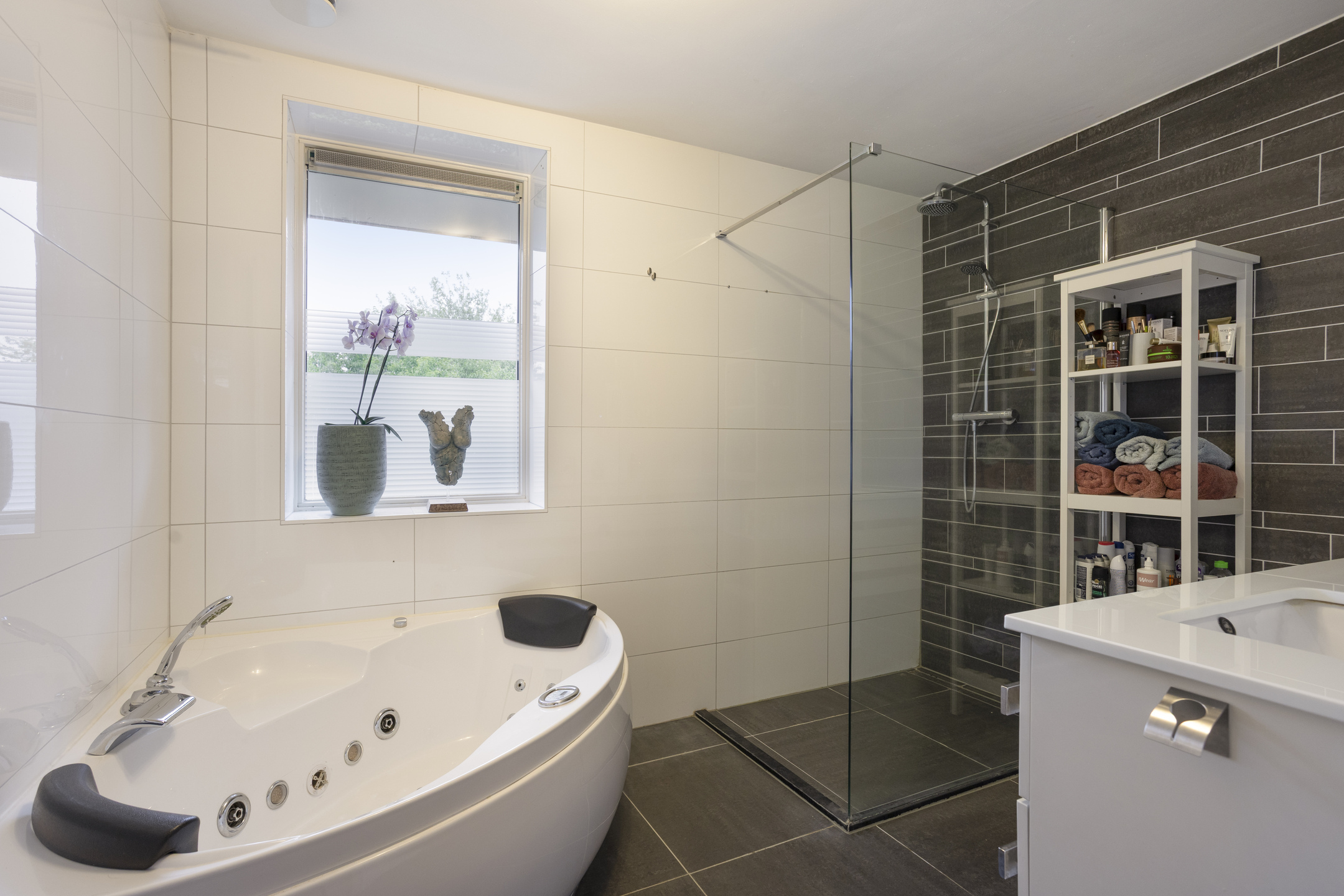 Overloop, separaat toilet, drie slaapkamers (vier mogelijk) waarvan 1 met een kastenwand en een verzorgde badkamer met whirlpool ligbad, inloopdouche en een wastafelmeubel