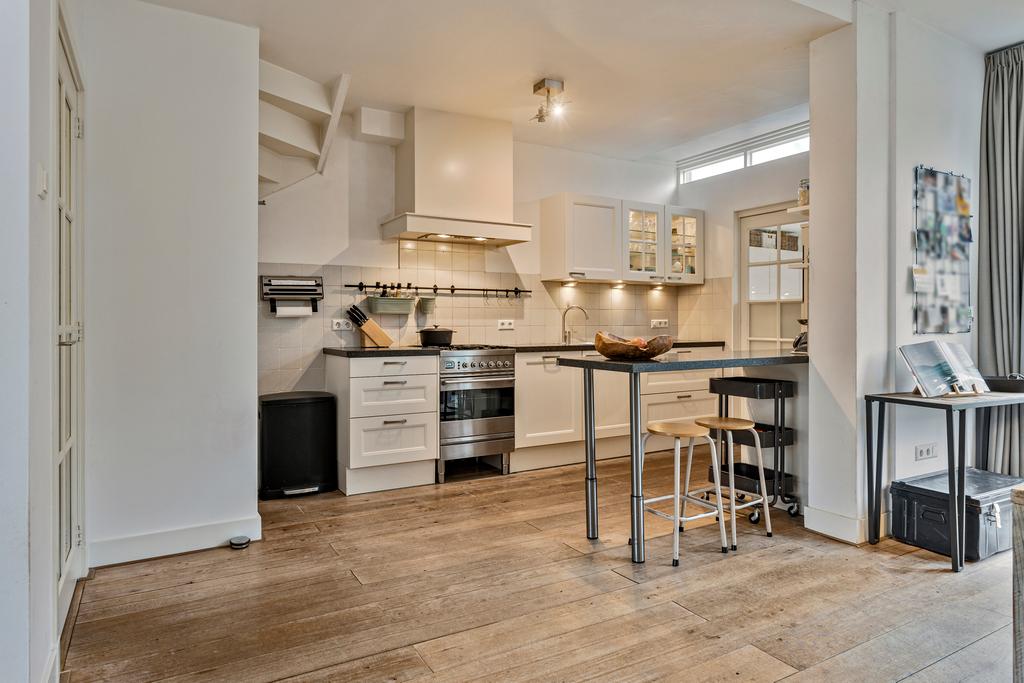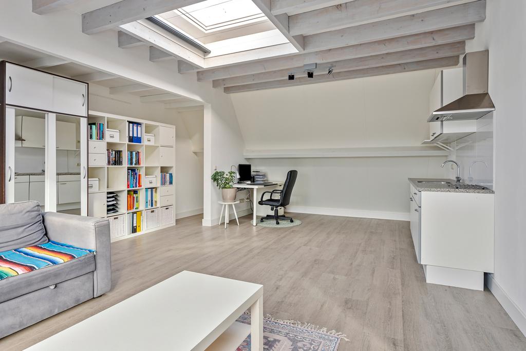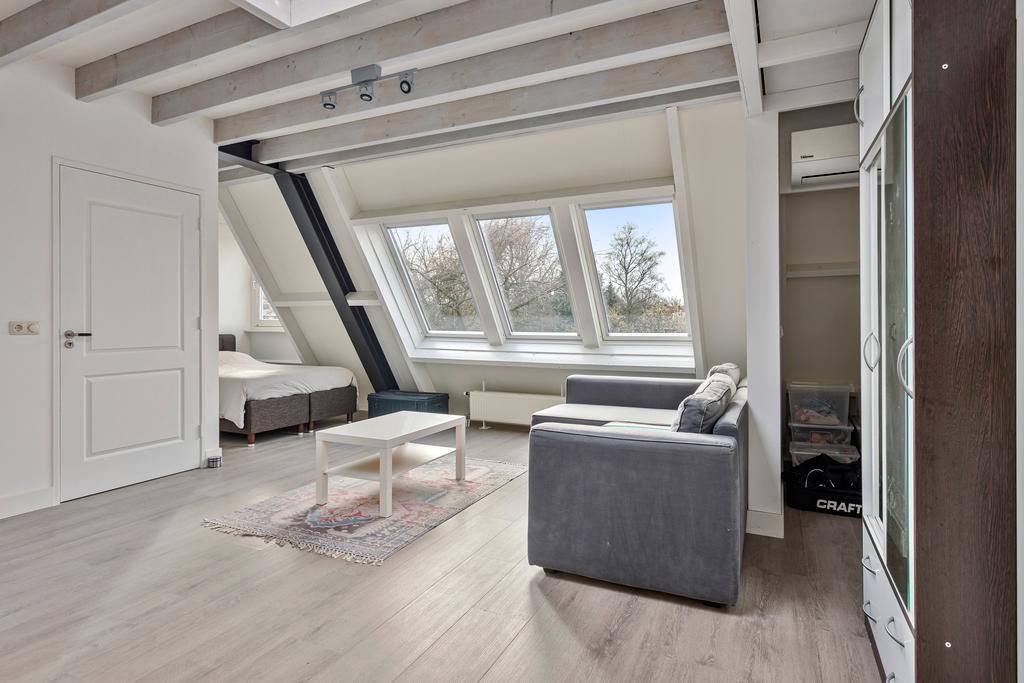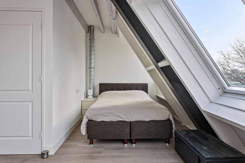 2e verdieping: Vaste trap naar grote zolderruimte (ca 51 m2). overloop, afgesloten wasruimte met dakkapelletje en de cv opstelling, zeer royale lichte zolderkamer met 3 grote dakramen, een lichtkoepel, een dakkapel, airco en een keukenbok. Deze ruimte biedt tal van mogelijkheden en is eventueel zelfs te gebruiken als een zelfstandige studio.