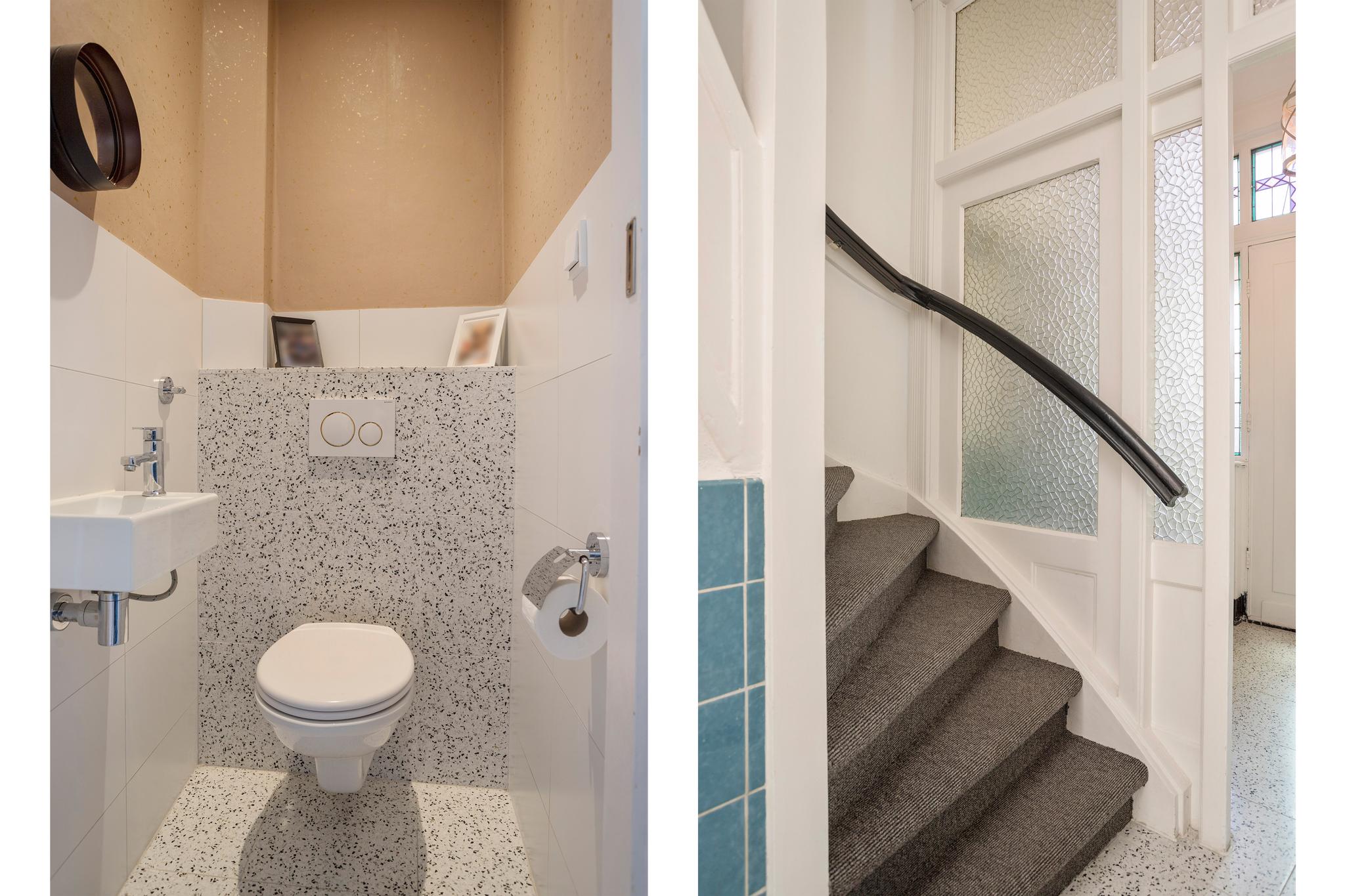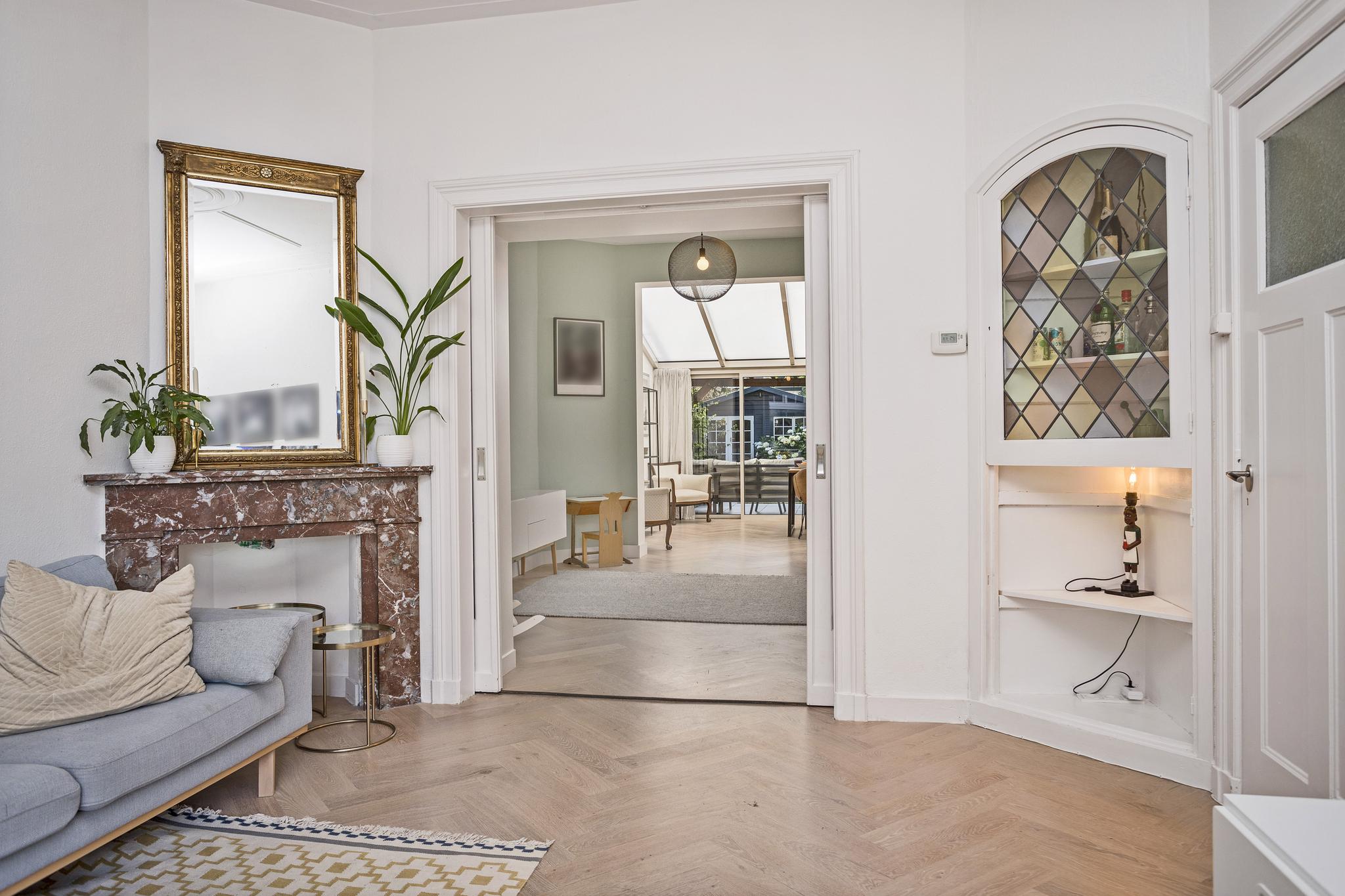 Begane grond: entree, tochtportaal met modern klassieke terrazzo vloer en glas in lood ramen. Deze vloer is ook te vinden in de gang, keuken en beide toiletten. De gang biedt toegang tot het toilet en de ruime provisiekelder (voorzien van wasmachine aansluiting). De sfeervolle woonkamer en suite heeft nog de originele schouw, plafonds en glas in lood schuifdeuren. De erker aan de voorzijde zorgt voor extra lichtinval. Aan de achterzijde is tevens een riante serre (met vloerverwarming en elektrische zonwering). De serre en de woonkamers zijn voorzien van een fraaie visgraat parketvloer. Vanuit de serre stap je via schuifdeuren de heerlijke achtertuin in met een terras en pergola. De moderne half-open keuken is voorzien een 5-pits Boretti fornuis.
