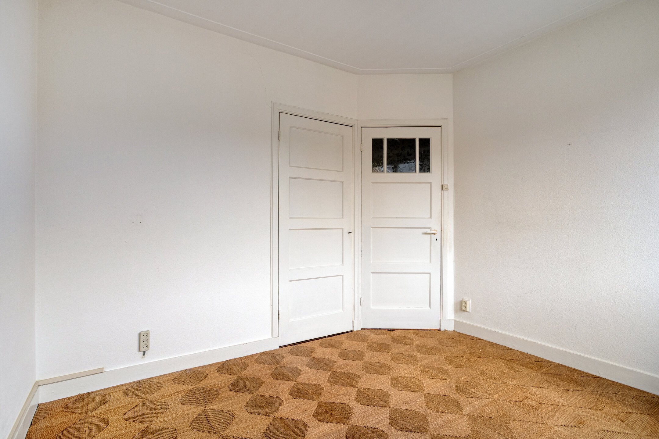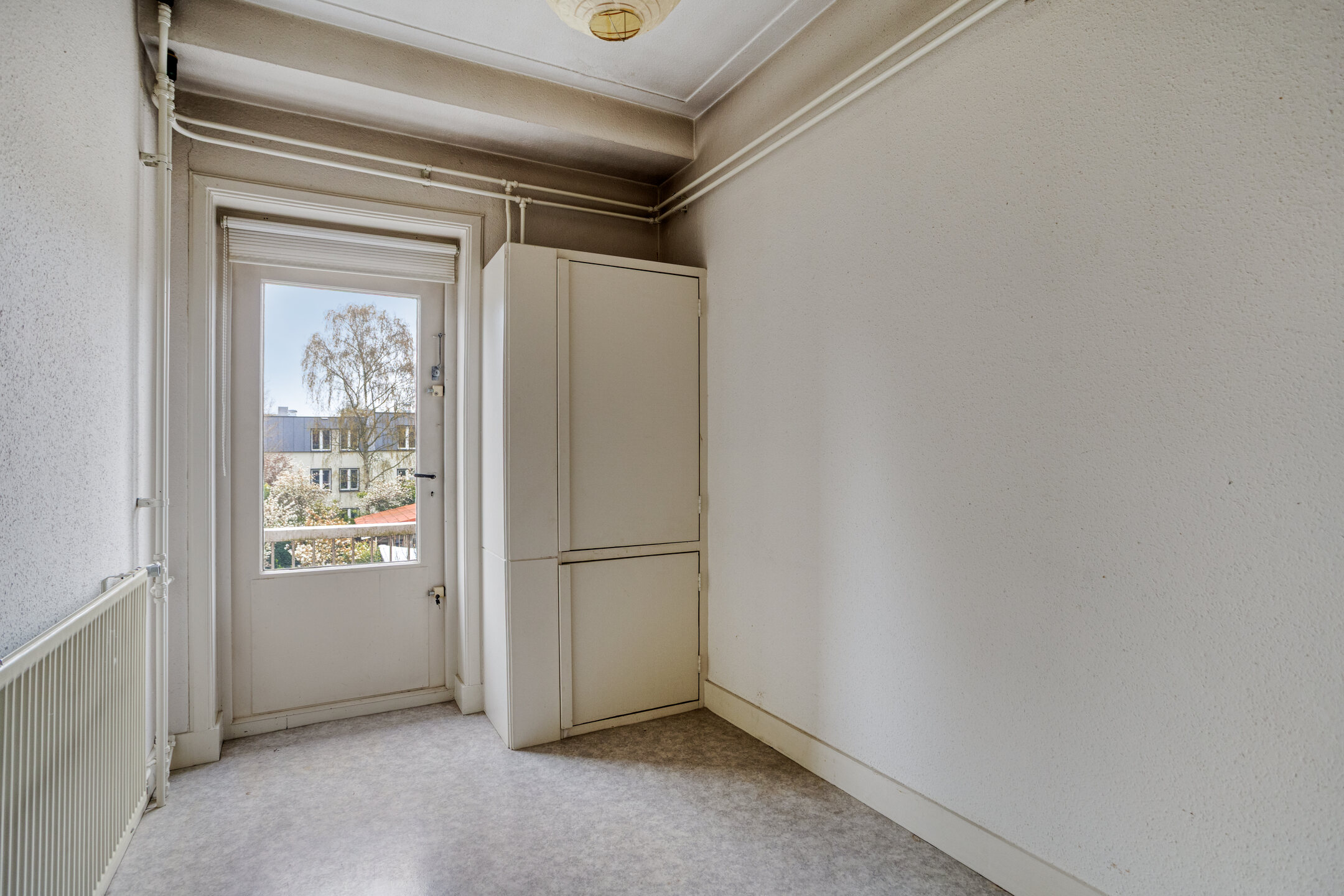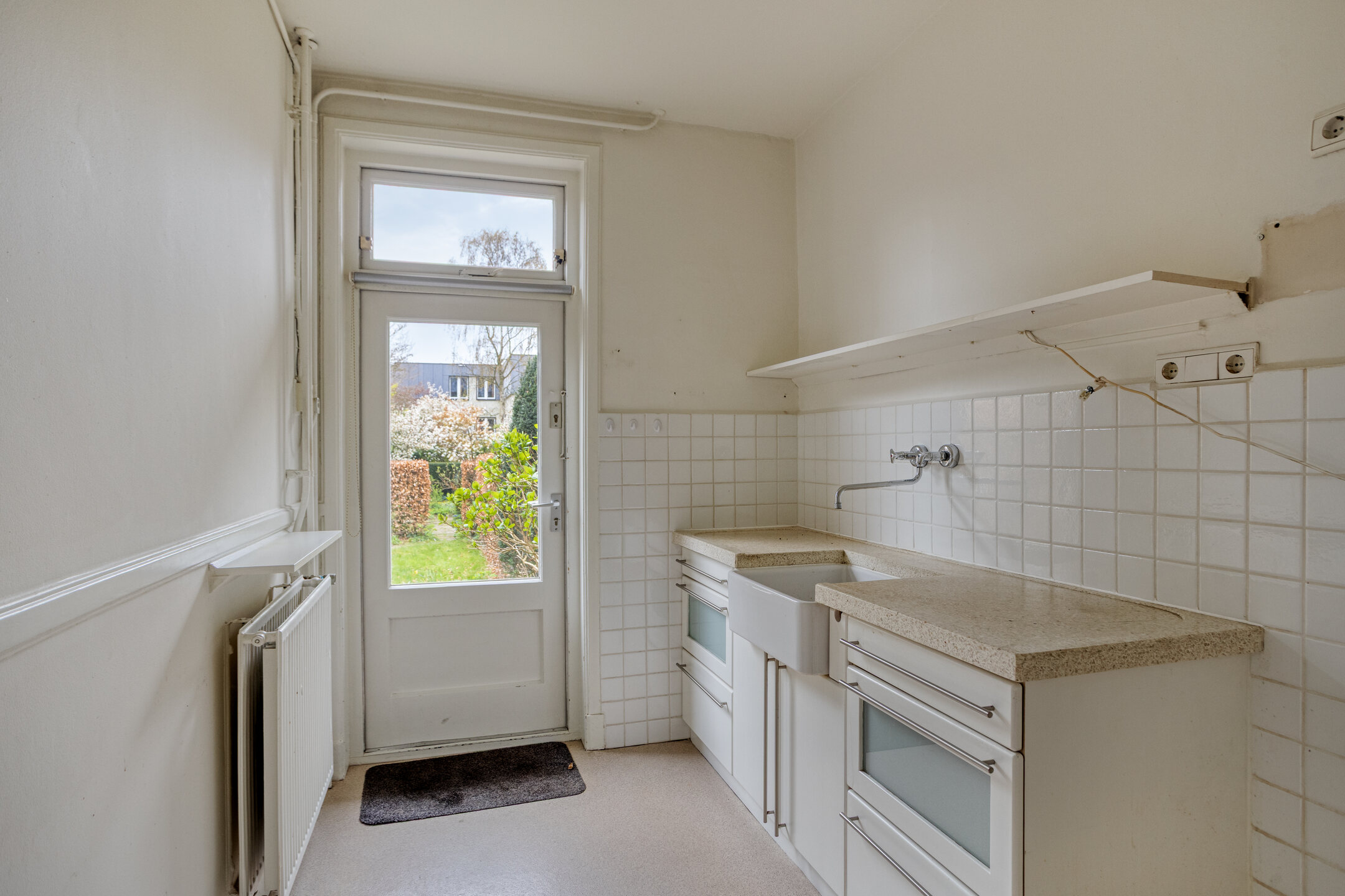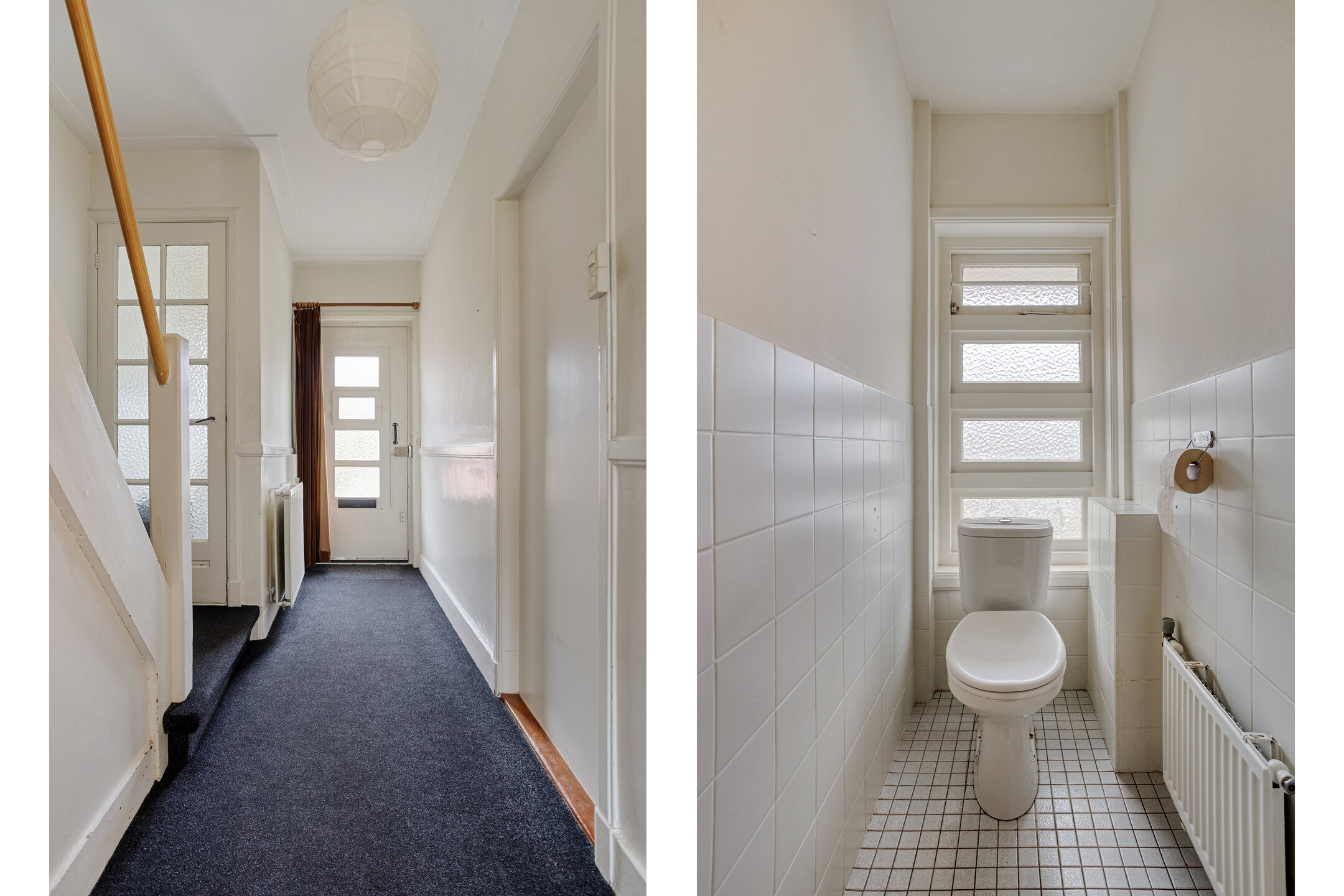 Entree, gang met toiletruimte. Deur naar de en-suite woonkamer met erker en houten vloer. De schouw, originele en-suite, lichtinval en inbouwkasten zorgen voor een sfeervolle living. Openslaande deuren naar de tuin en een eenvoudige keuken.