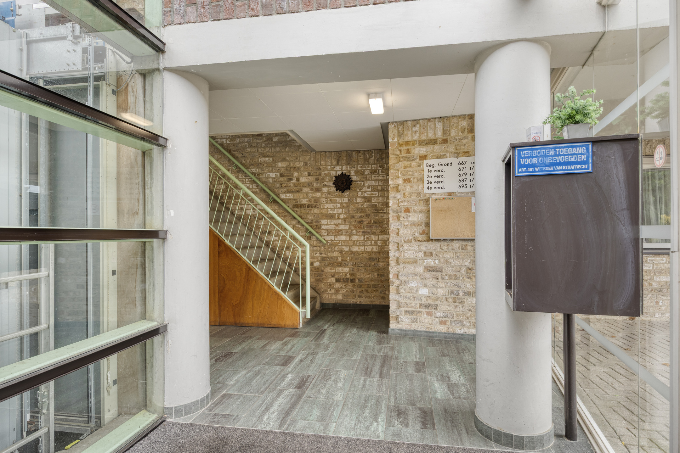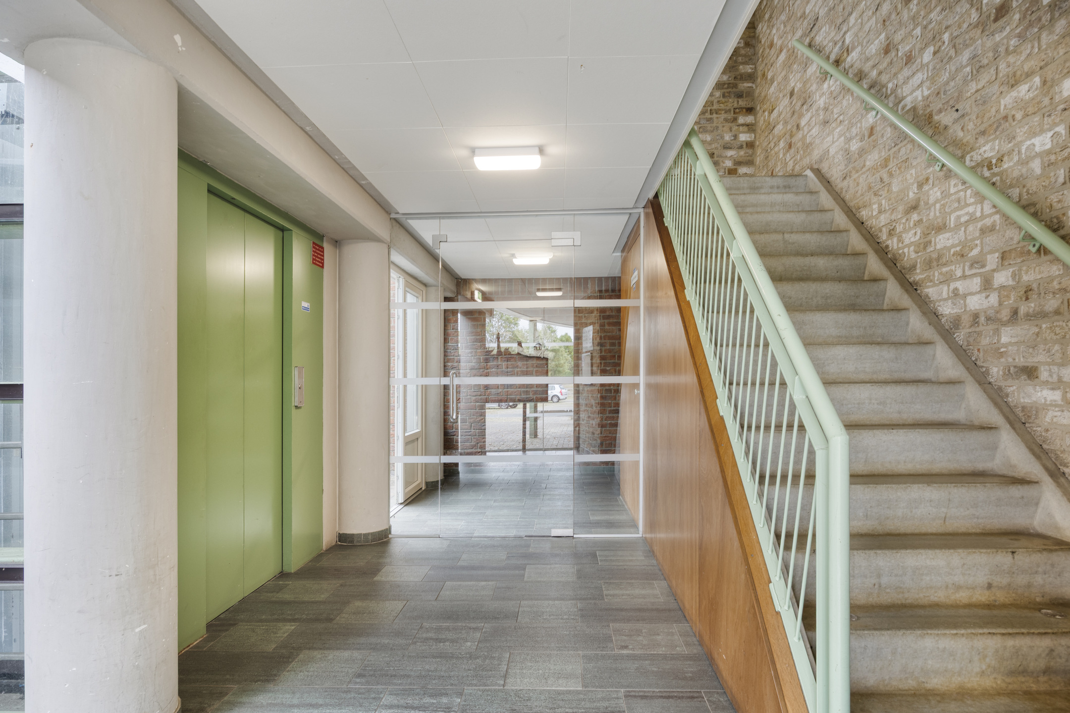 Entree, intercom en brievenbussentableau, centrale hal met trappenhuis en lift. Via hal toegang naar de eigen fietsenberging met stroom.