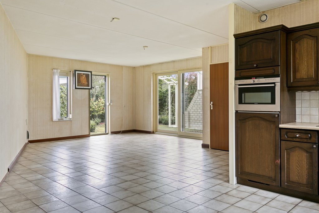 Bij binnenkomst wandel je een ruime woonkamer binnen. Door een schuine wand heeft het vertrek een speelse indeling. De keuken is aan de voorzijde gesitueerd en is voorzien van diverse inbouwapparatuur. Een grote schuifpui geeft toegang tot de achtertuin met terrasoverkapping, hier kun je optimaal genieten want door de hoekligging is de privacy optimaal.