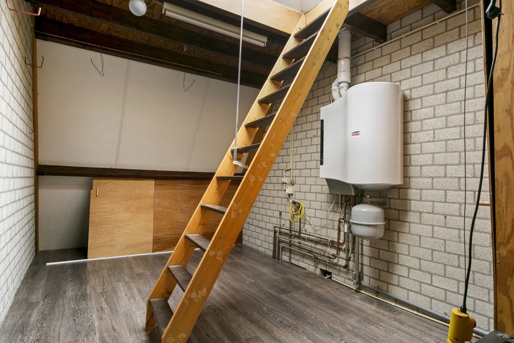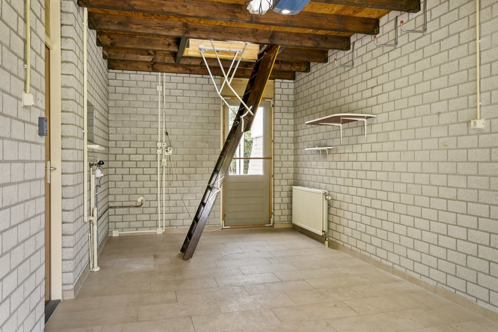 Via de gang is er een toegang tot de garage met vliering (samen groot 36 m2). Hier treft je o.a. de opstelling van wasmachine en droger. En dan zal je denken wat doet die vlizotrap in dit vertrek….een kleine verassing, op de verdieping is nog een mooie hobbyruimte met lichtkoepel.
