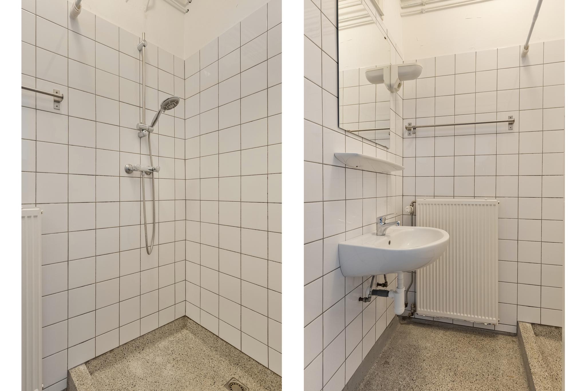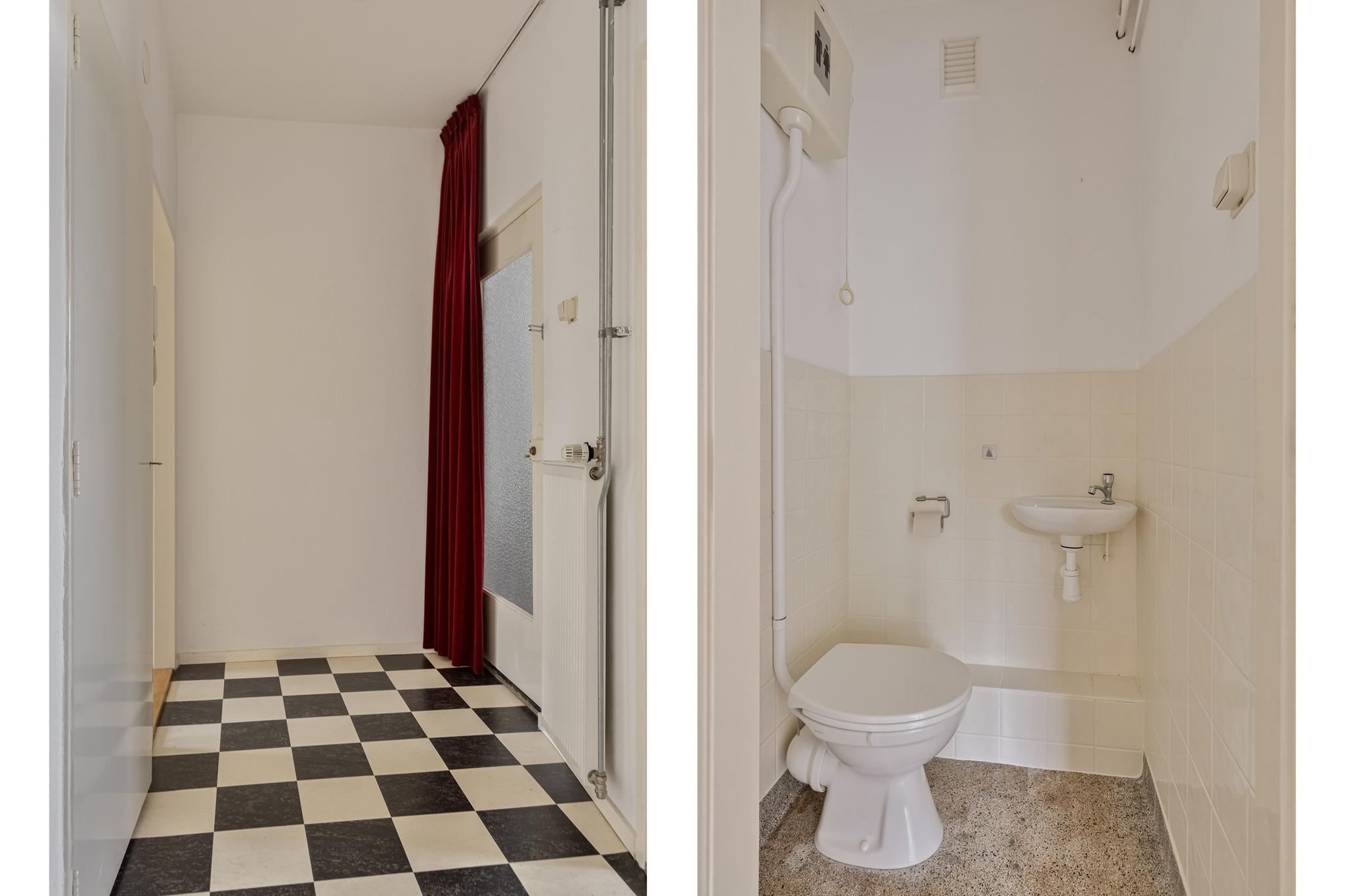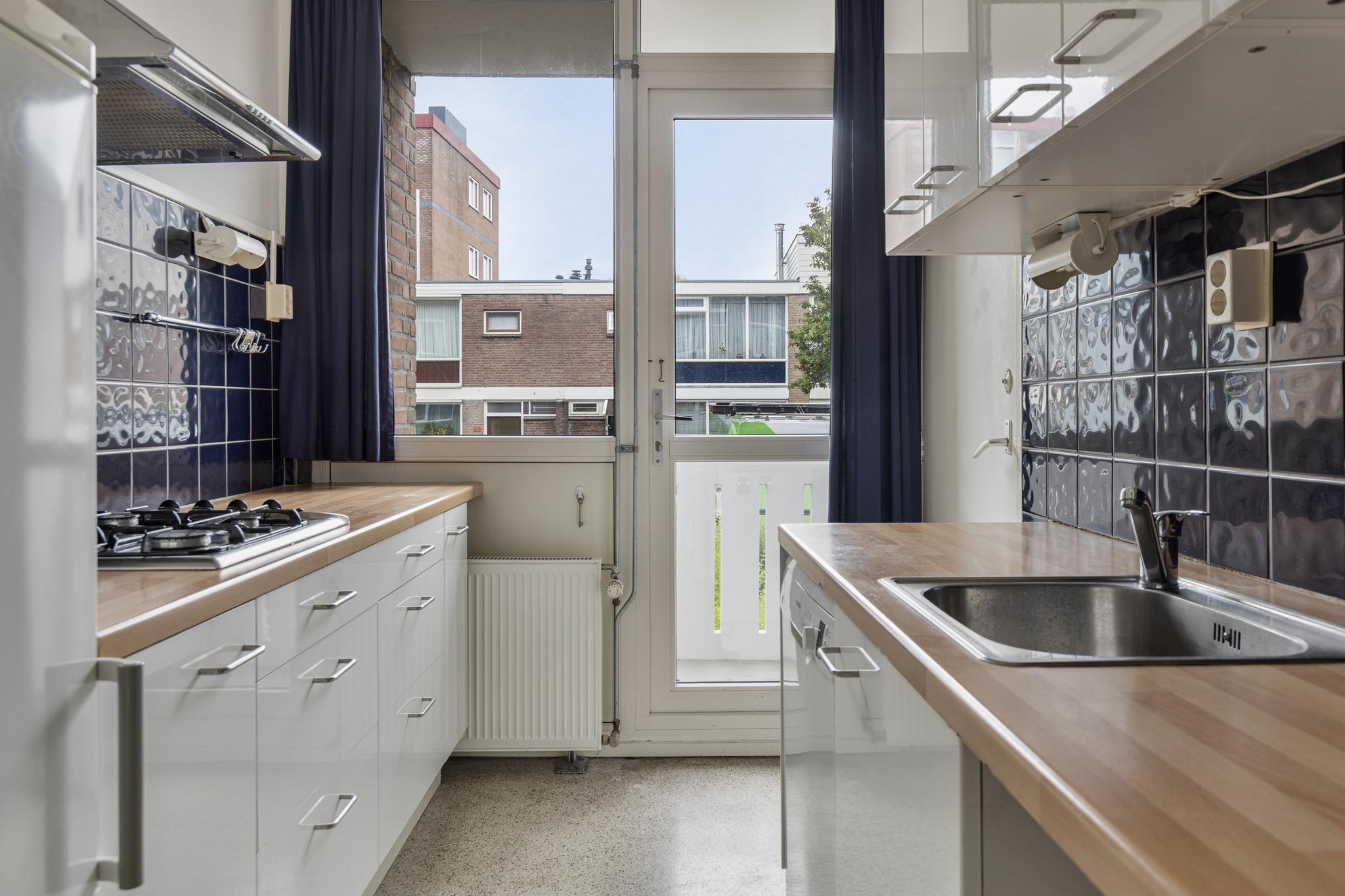 Entree, gang met toilet, meterkast en vaste (inbouw) kast. De 2 slaapkamers aan de achterzijde van het complex zijn voorzien van inbouwkasten, de grootste slaapkamer is tevens voorzien van een vaste wastafel. De voormalige derde slaapkamer is bij de woonkamer getrokken waardoor er een grote doorzon-woonkamer is ontstaan met lichtinval van zowel de voor- als achterzijde. De woonkamer is voorzien van een laminaatvloer uit 2017 en een zonnig balkon (ligging Zuid). De gesloten keuken is voorzien van 4-pits rvs-gasfornuis en een rvs-afzuigkap. De keuken geeft toegang tot het 2e balkon met een vaste kast. Vanuit de keuken is de badkamer bereikbaar die uitgerust is met een douche en vaste wastafel.