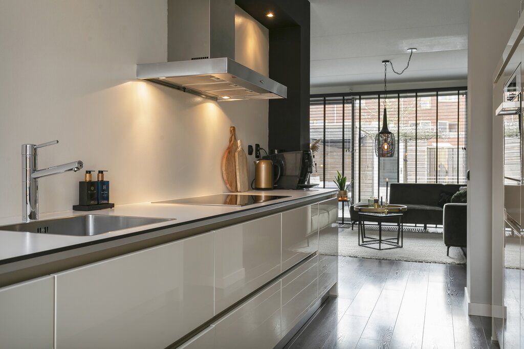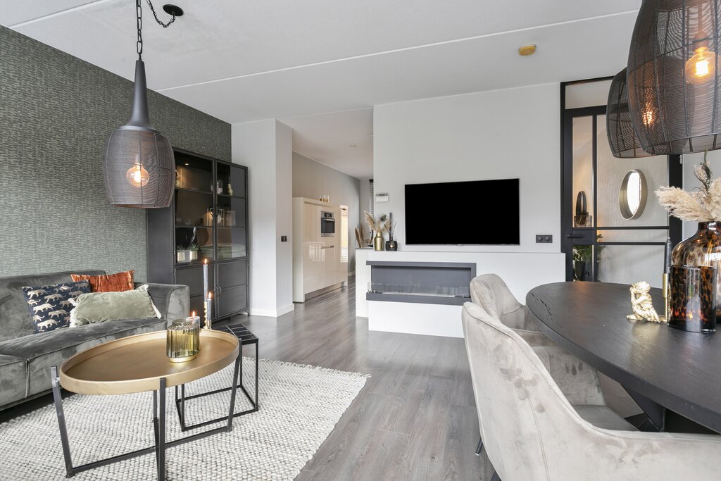 Entree, hal met een garderobenis, meterkast, vrij dragend toilet met fonteintje, diepe gangkast/berging, zeer lichte woonkamer met een openhaard (op bio ethanol) en een aluminium schuifpui met uitkijk op de sfeervolle zonnige tuin op het zuiden. De luxe halfopen keuken heeft openslaande deuren naar de voortuin en het plein waaraan de woning is gelegen. De keuken is voorzien van opbergruimte en diverse inbouwapparatuur. In de keuken is de mogelijkheid om een kleine zithoek/eetgedeelte te maken. Er is een tv aansluiting in de keuken aanwezig.