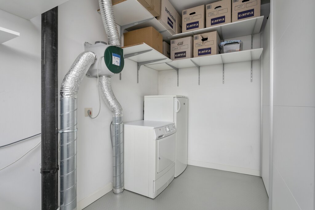 Vaste trap naar ruime lichte overloop met dakkoepel, riante 4e slaapkamer en een grote separate wasruimte/berging met mechanische ventilatie-unit en aansluiting voor wasmachine en droger.