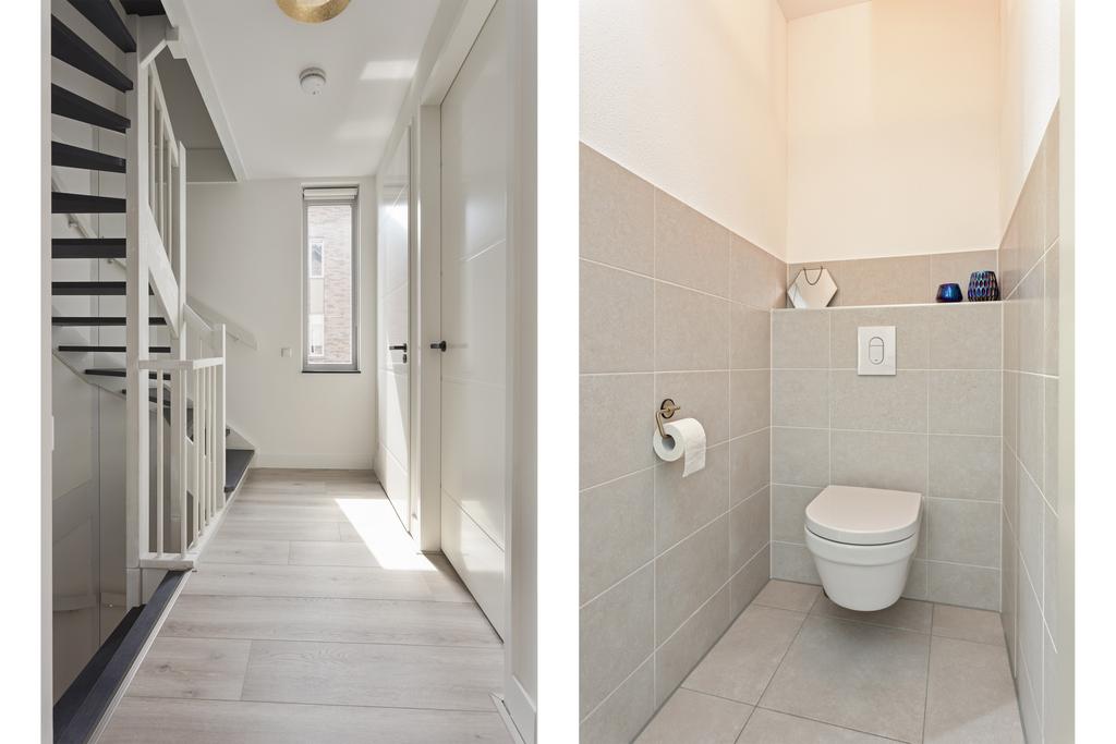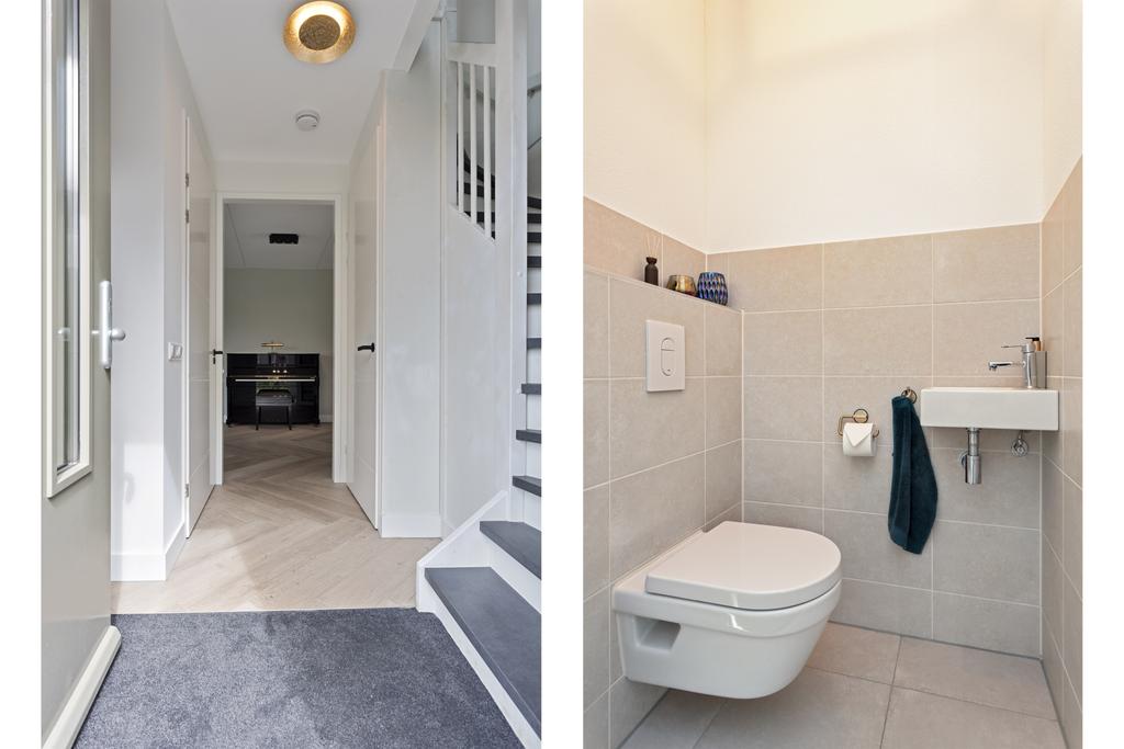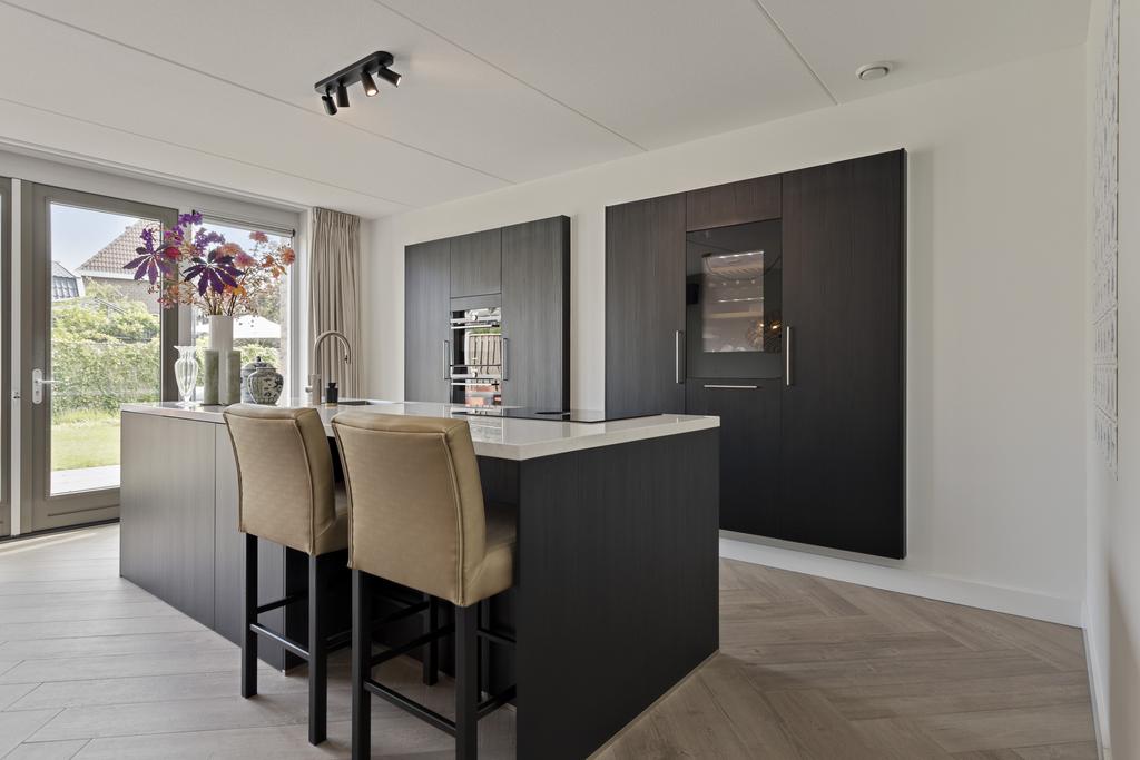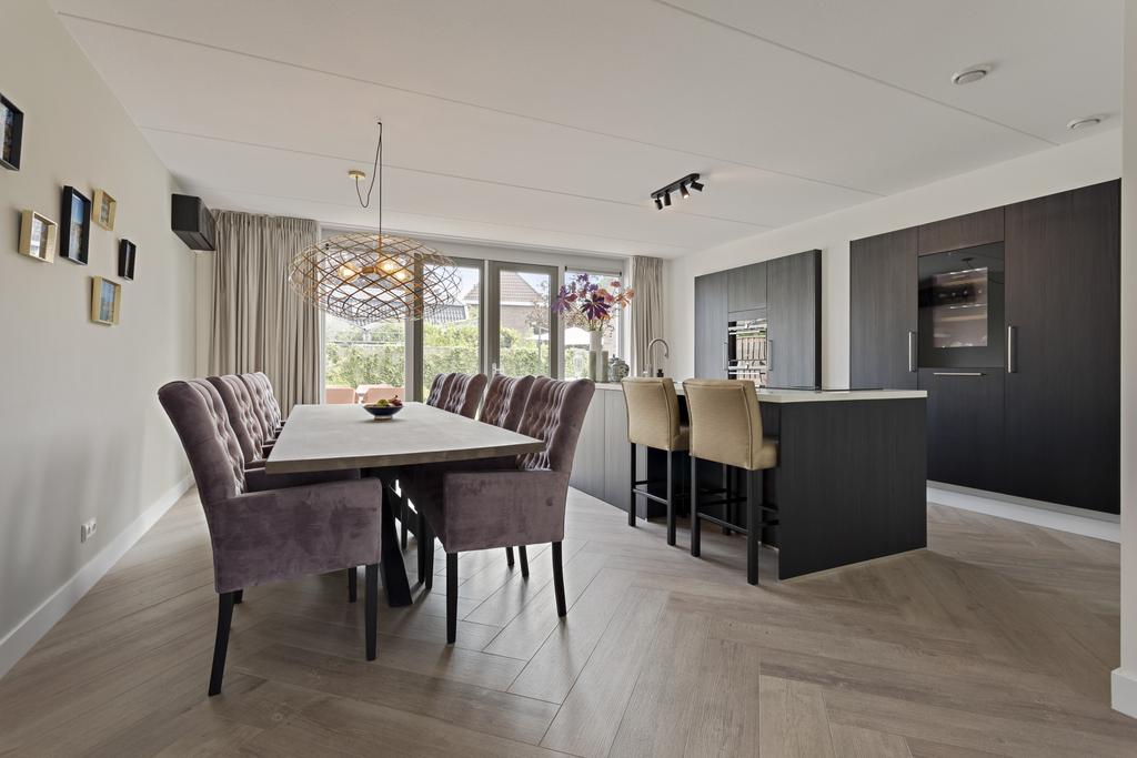 Entree, hal met moderne toiletruimte, uitgebreide meterkast en garderobe in trapkast, riante woonkamer (6 meter breed en 13 meter diep) met gezellige straatgerichte zithoek, gezellige luxe woonkeuken met spoel/kookeiland, een bar en alle denkbare inbouwapparatuur: Inductie Bora kookplaat / Quooker Flex / Vaatwasser / Koelkast / Vriezer / Wijnklimaatkast en een Natuurstenen aanrechtblad.