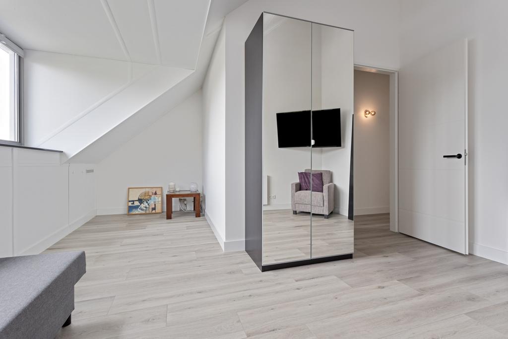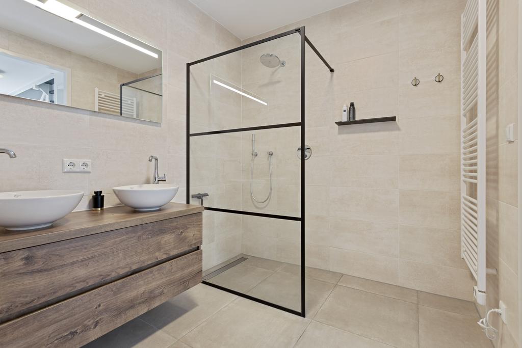 Overloop, afgesloten wasruimte, 2 riante zolderkamers beide voorzien van een dakkapel, 2e complete luxe badkamer voorzien van inloop regendouche, wastafel met meubel, spiegel en een toilet.