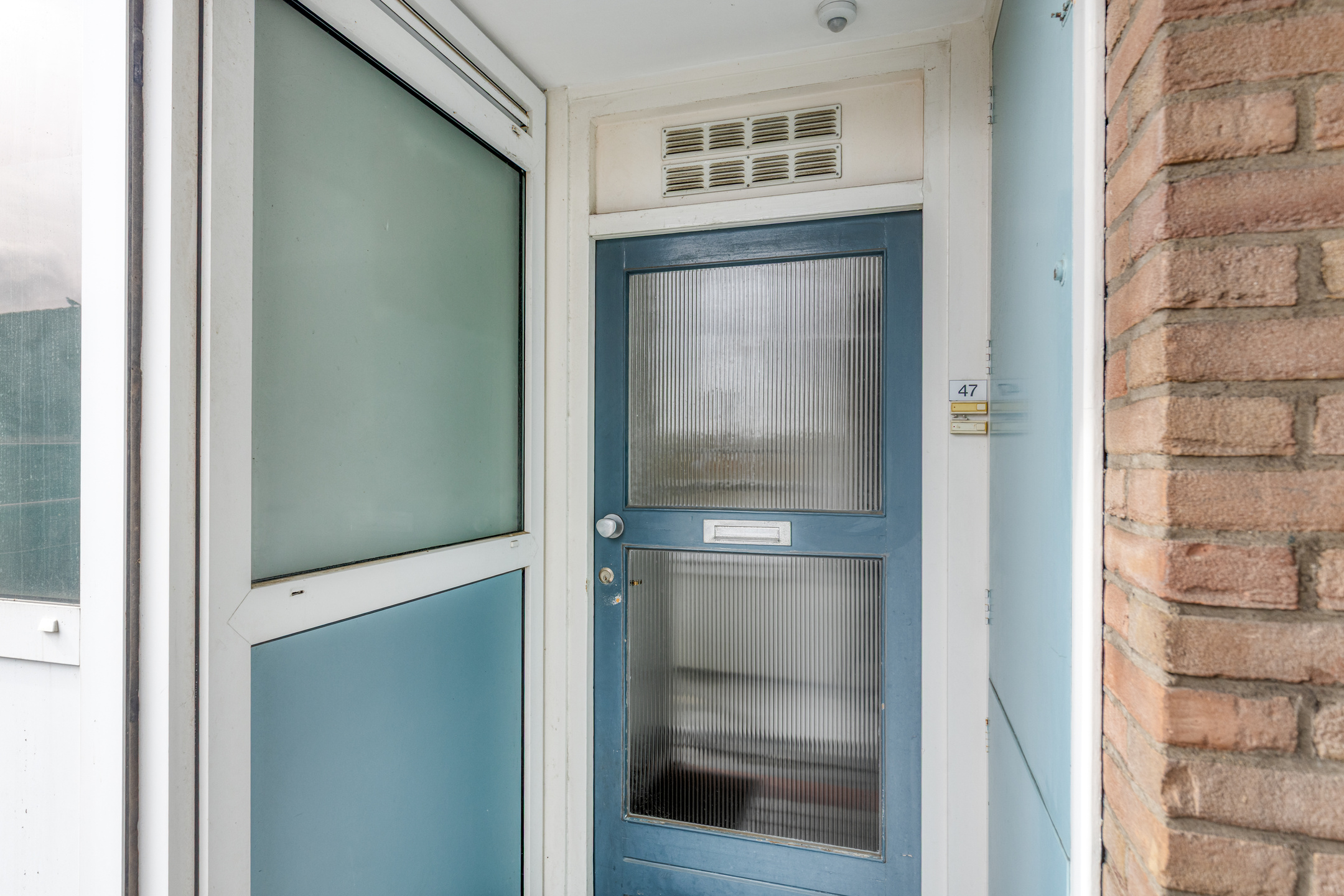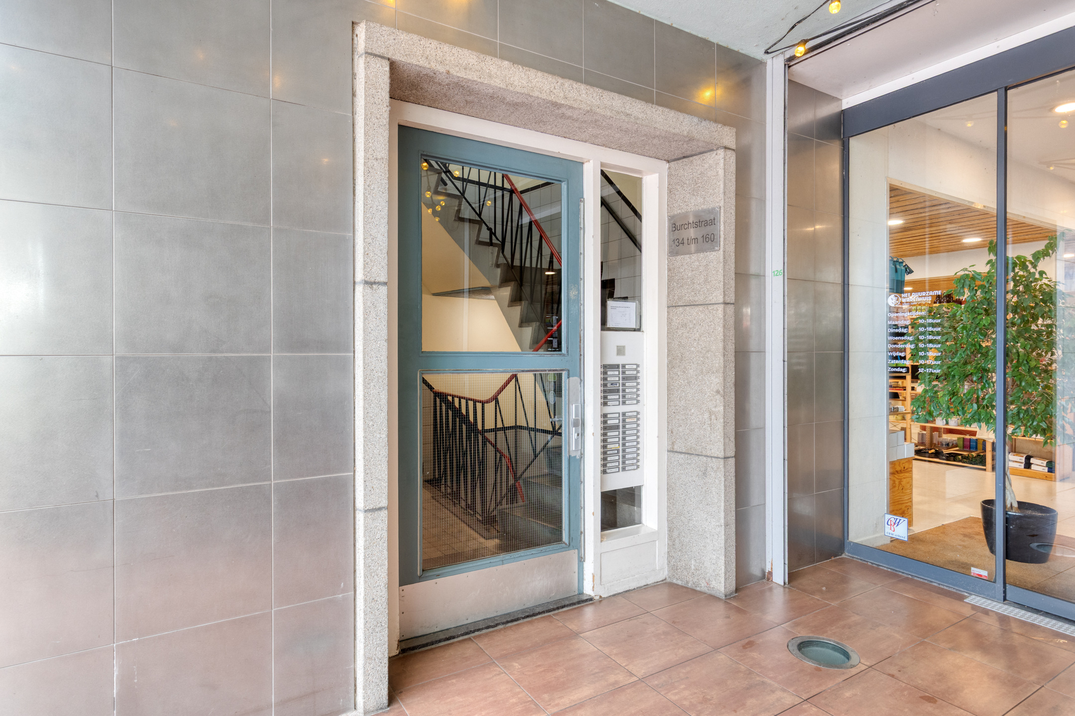 Afgesloten entree met bellentableau, intercom, trappenhuis en lift.