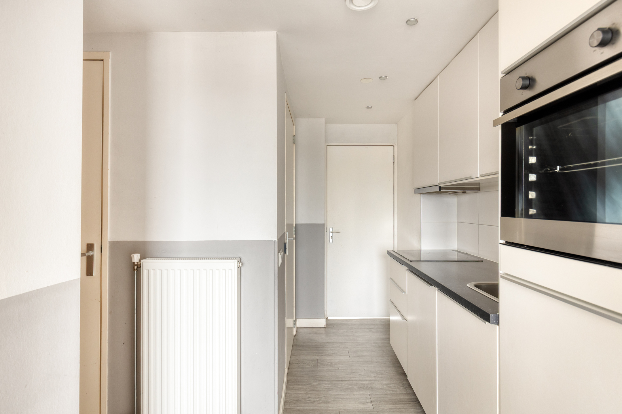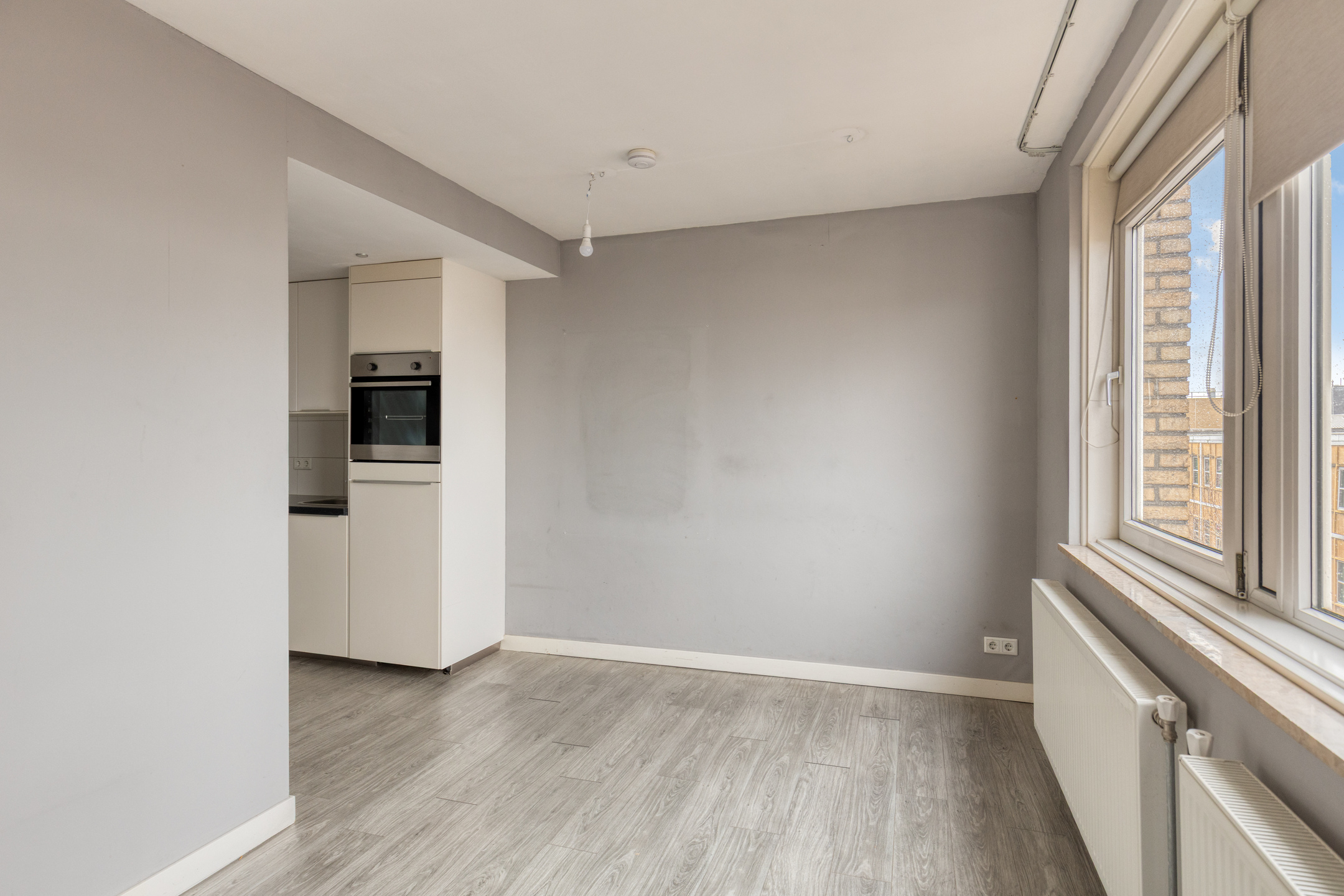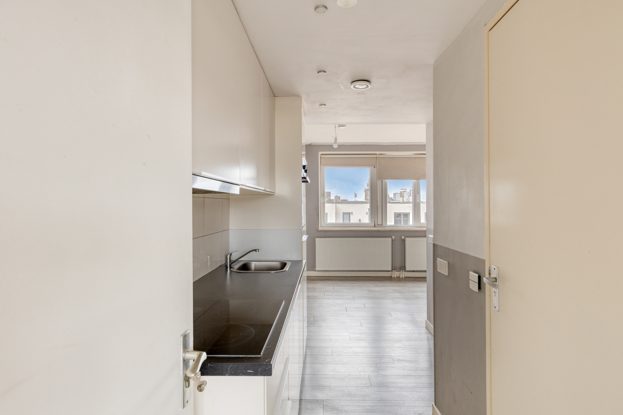 Gang met vaste kastenwand, open keuken voorzien van inbouwapparatuur, lichte woonkamer, slaapkamer met vaste kast en toegang tot het balkon met vrij uitzicht over het centrum van Nijmegen. De badkamer is uitgerust met een douche, wastafel en toilet.