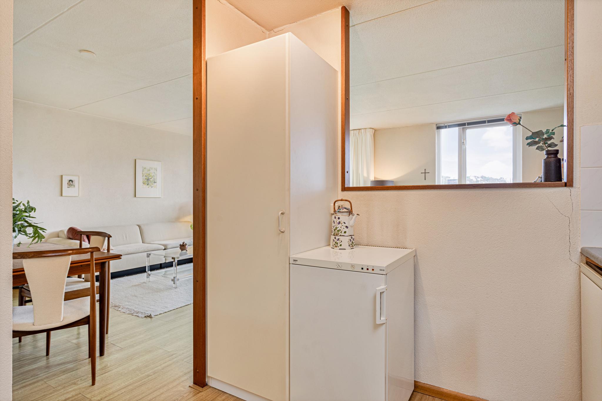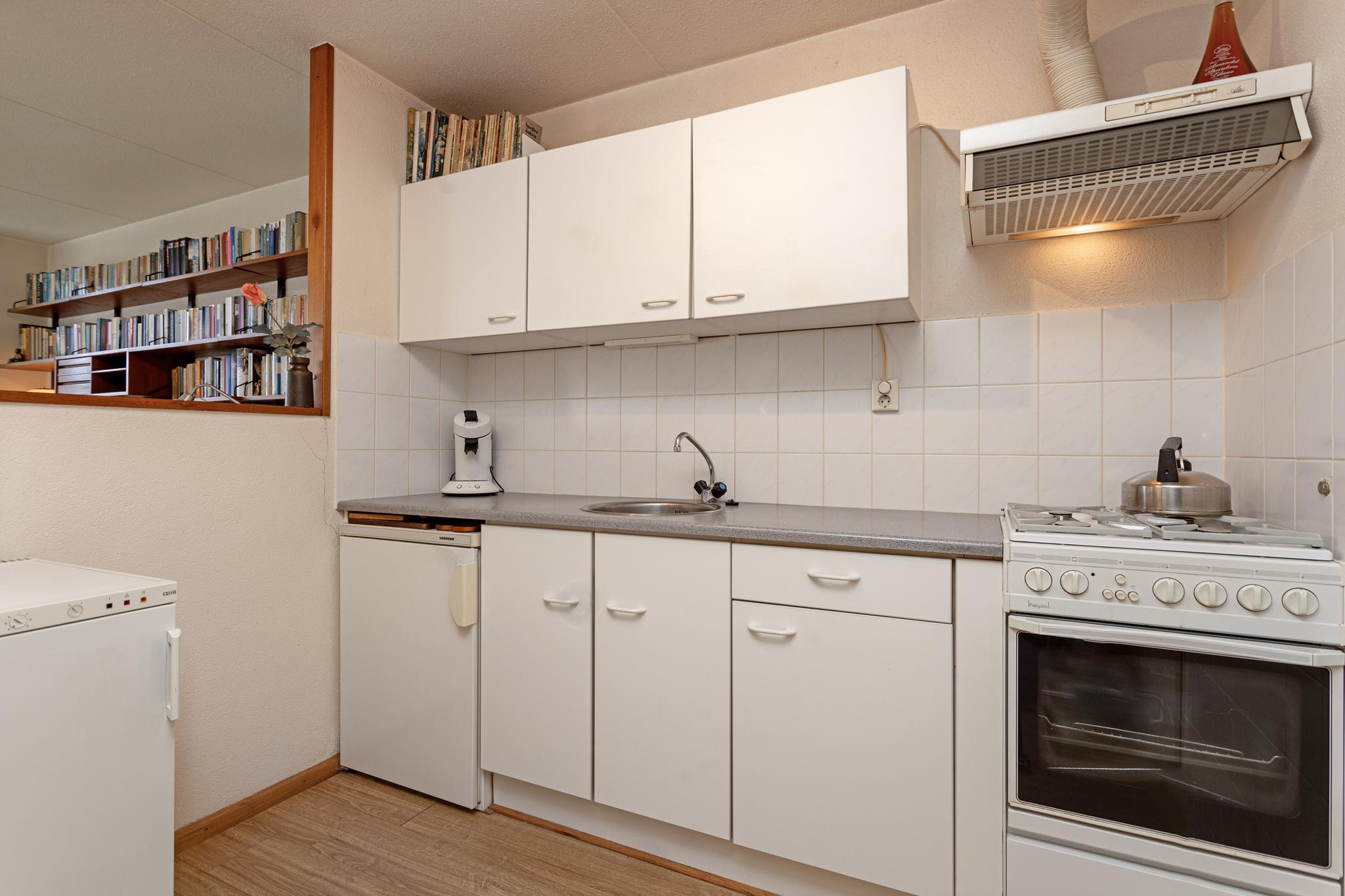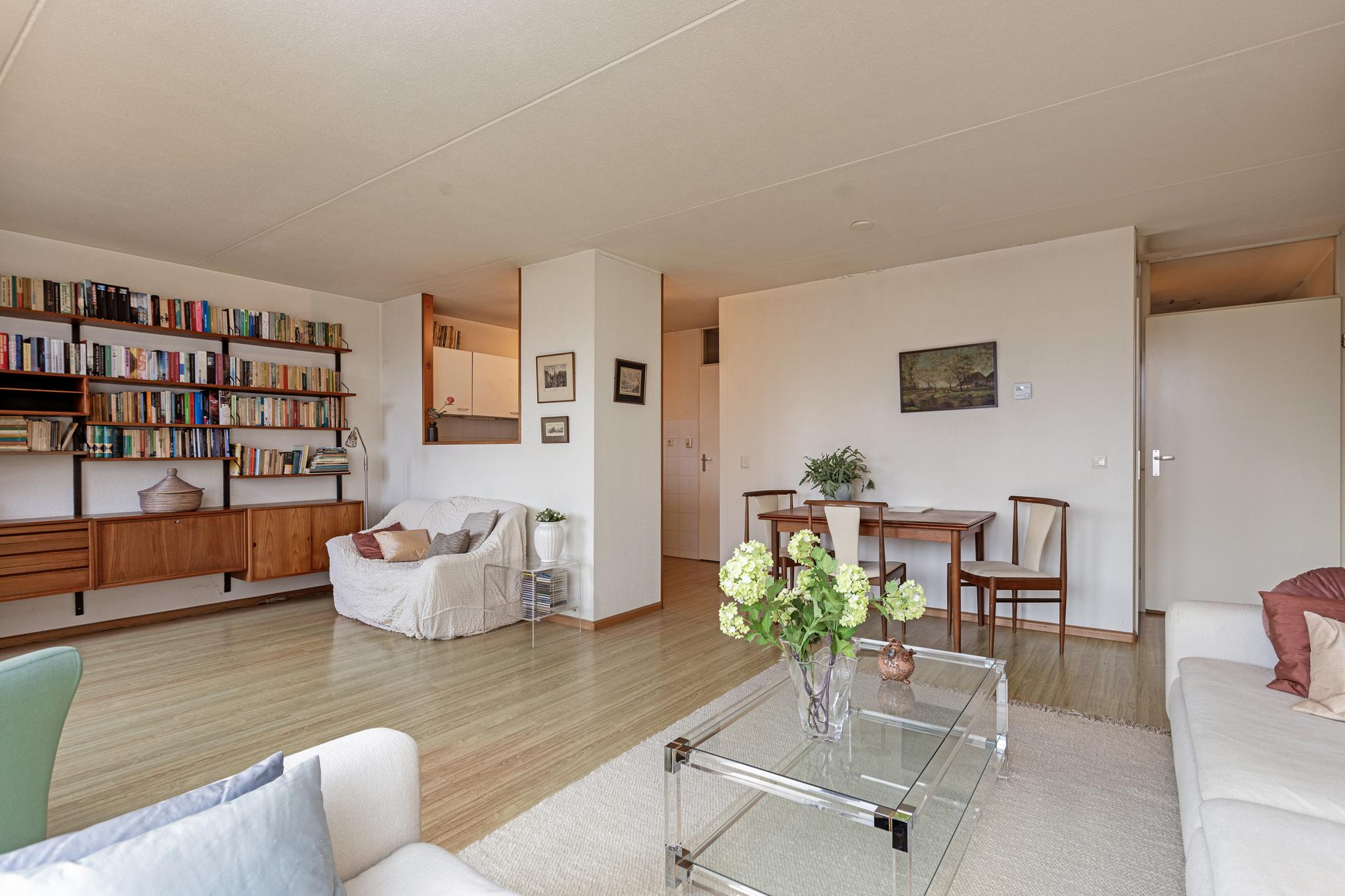 Entree, hal, gang, separate toiletruimte, gezellige lichte woonkamer met openslaande deuren naar het balkon (zuid-oost), half open eenvoudige keuken met een vaste kast, badkamer met douche en een wastafelmeubel, 2 slaapkamers (gelegen aan de galerij) en 1 is voorzien van een vaste kast,