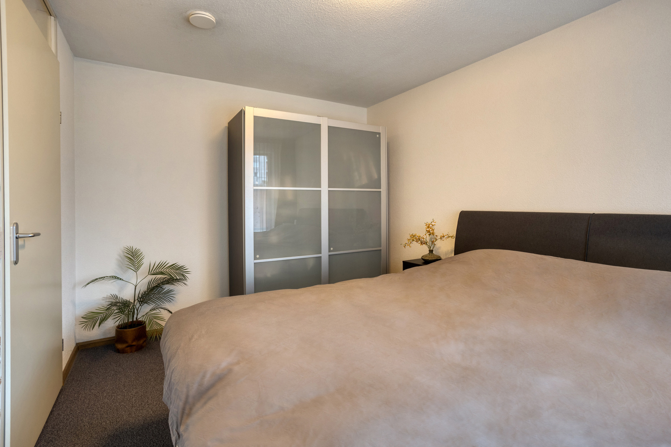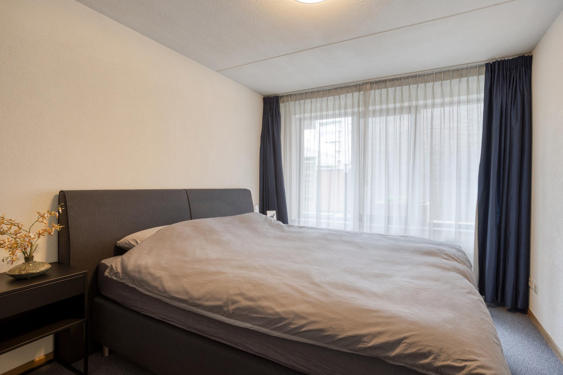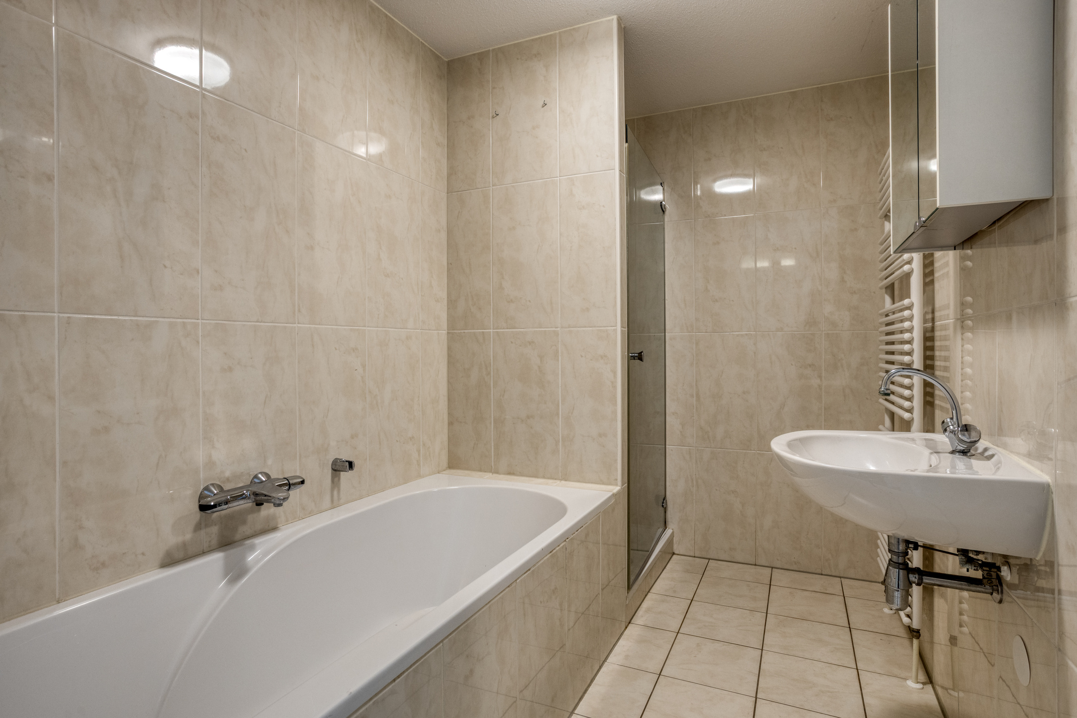 Vanuit de hal bereik je de ruime slaapkamer, gelegen aan de binnenplaats van het appartement. De nette badkamer is compleet uitgevoerd met een douche, ligbad en wastafelmeubel. Daarnaast is er een praktische inpandige berging met cv-opstelling (Intergas 2025) en aansluitingen voor een wasmachine.