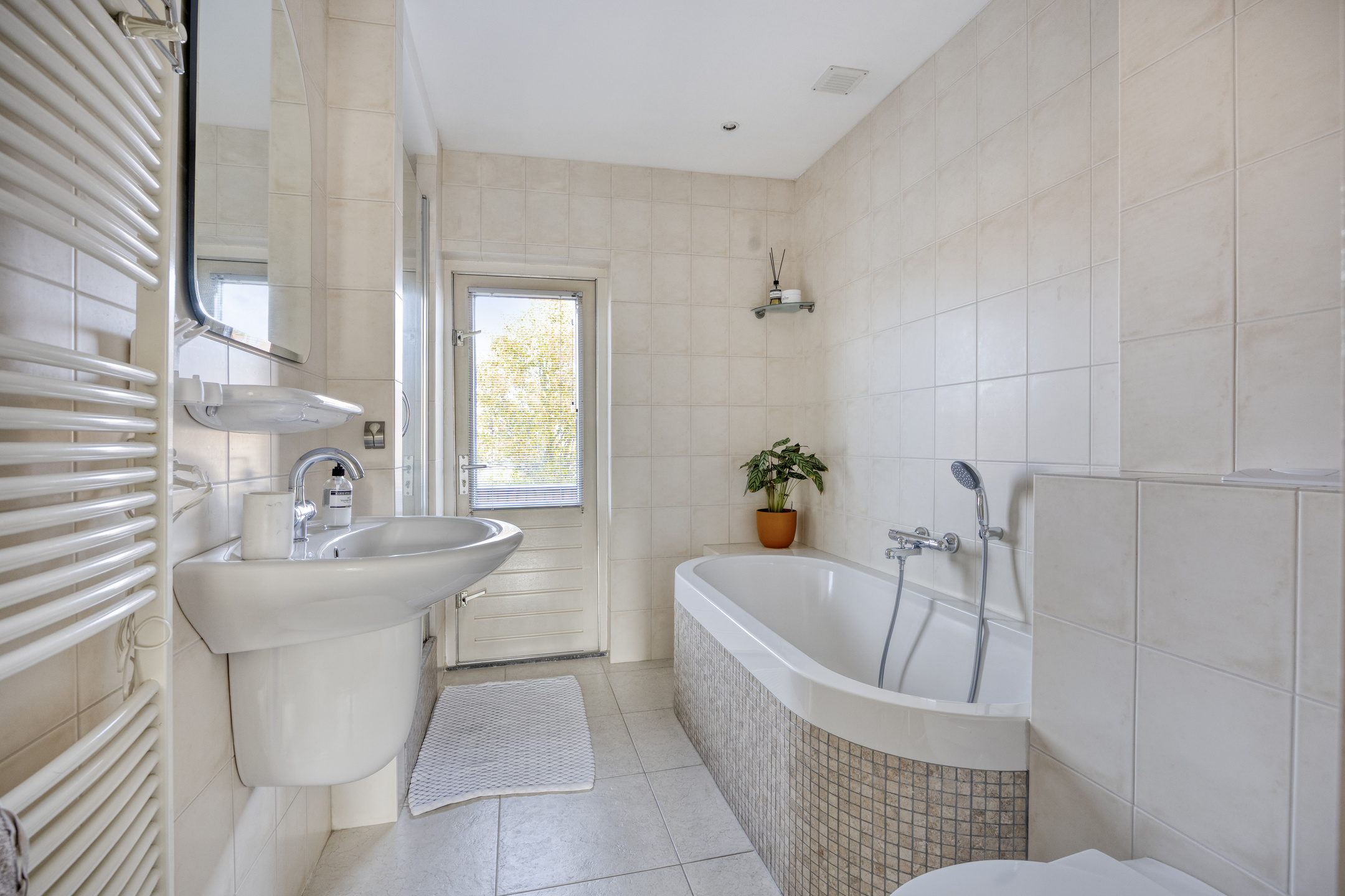 Overloop met toegang tot drie slaapkamers en een ruime, nette complete badkamer voorzien van ligbad, douche, wandcloset, wastafelmeubel, designradiator, elektrische ventilatie en deur naar het balkon. De badkamer is uitgevoerd in een lichte kleurstelling en beschikt over ingebouwde spotverlichting.