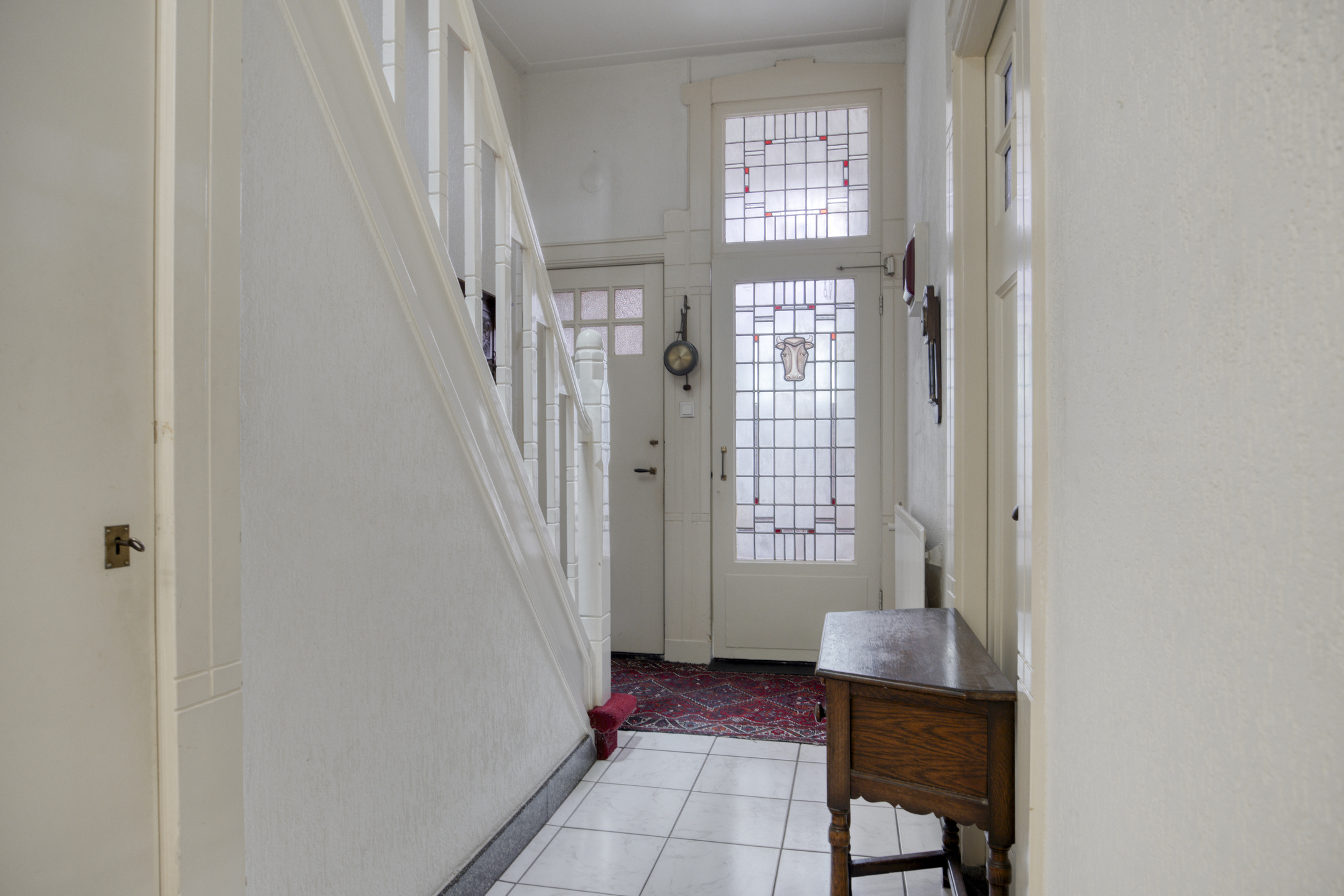 Entree / vestibule met prachtige originele tegels en mooie glas-in-lood / ruime gang en een authentiek toilet met fonteintje / berging/ bijkeuken met aansluitingen witgoed / zeer ruime kamer en suite met erker, indrukwekkend hoog plafond met ornamenten, prachtige lichtinval en veel sfeer / half open keuken aan de achterzijde.