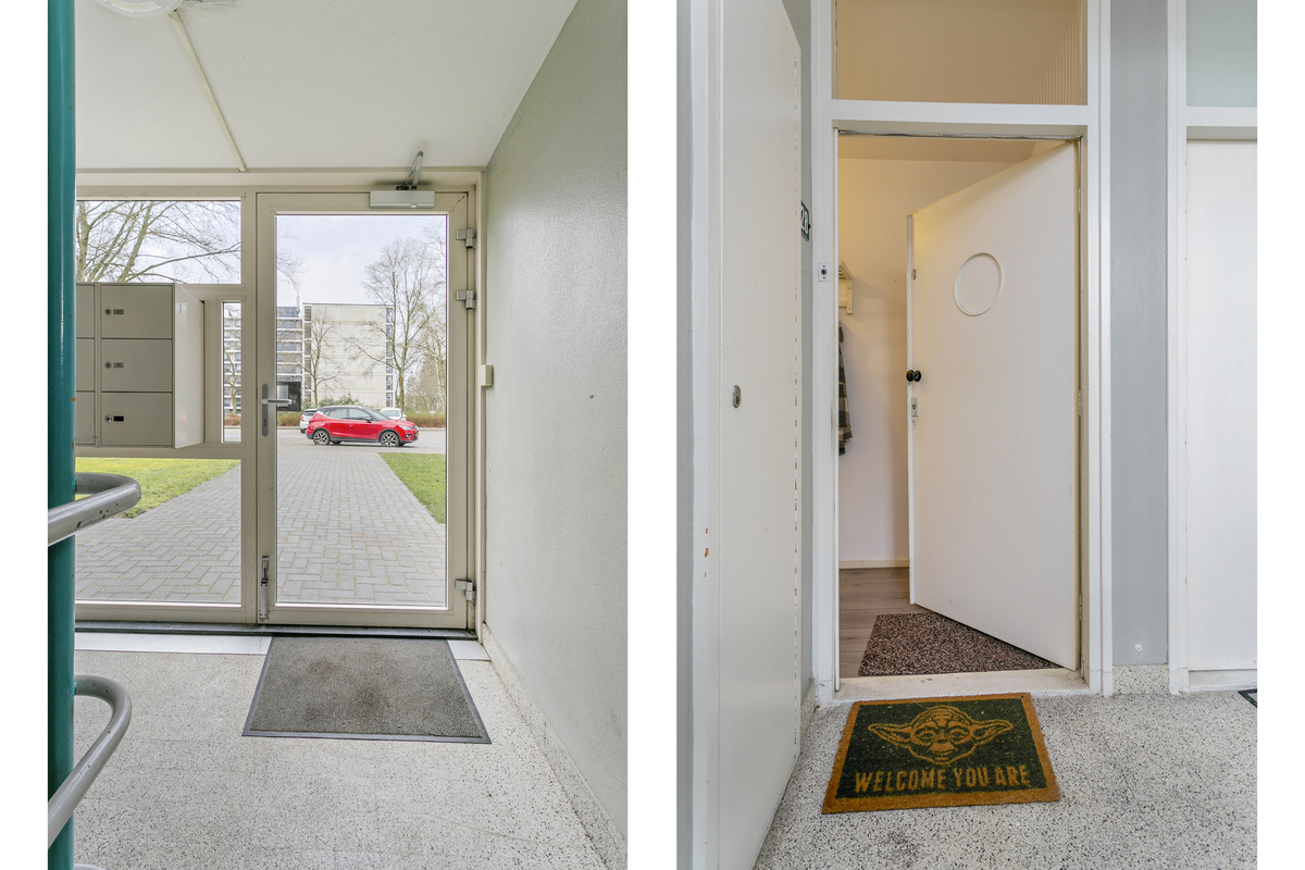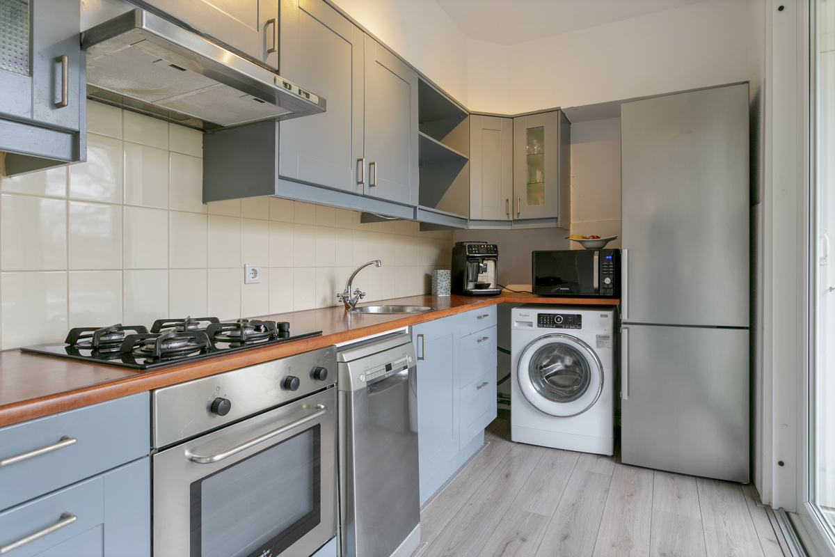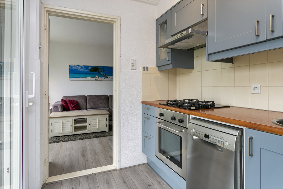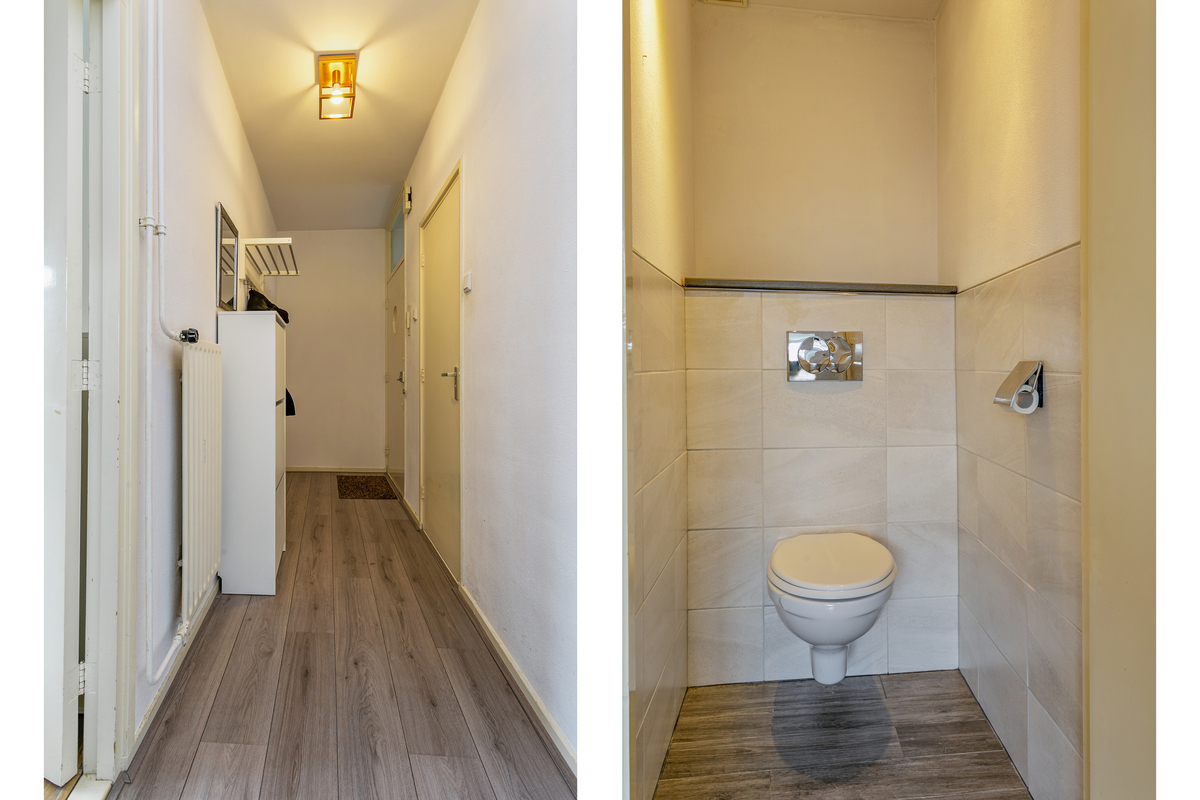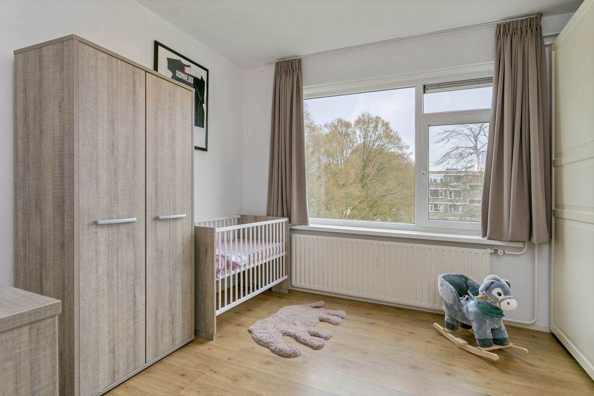 Entree, hal met bergkast en (separaat) toilet ’17. Woonkamer met veel lichtinval middels de grote raampartijen en toegang tot de gesloten keuken. Deze is voorzien van functionele inrichting en wasmachine-aansluiting. Vanuit de keuken is het balkon met vaste kast te bereiken. De twee slaapkamers zijn aan de achterzijde van het appartement gelegen. Tot slot de moderne badkamer ’21 met douche, wastafelmeubel en een kast.