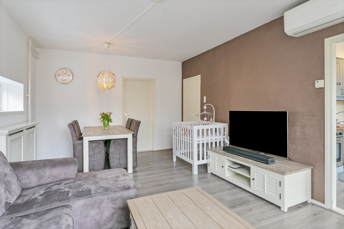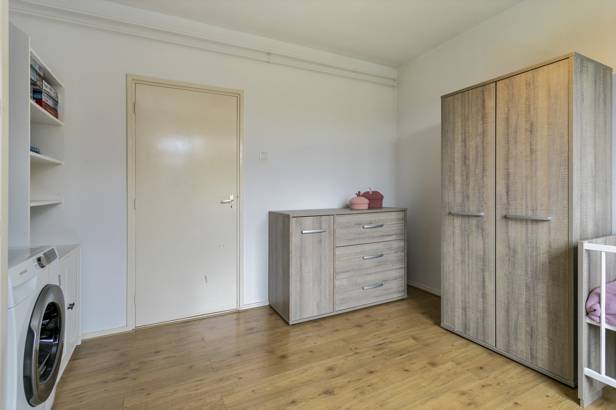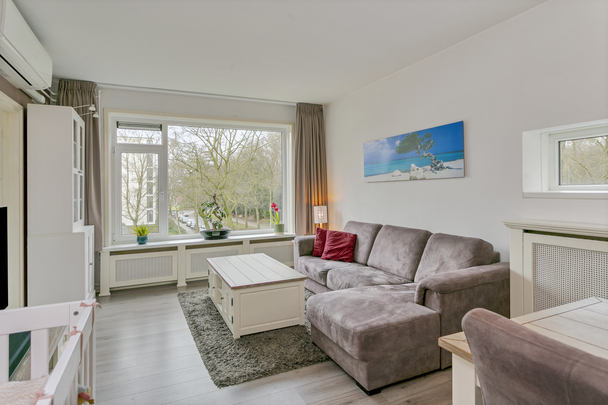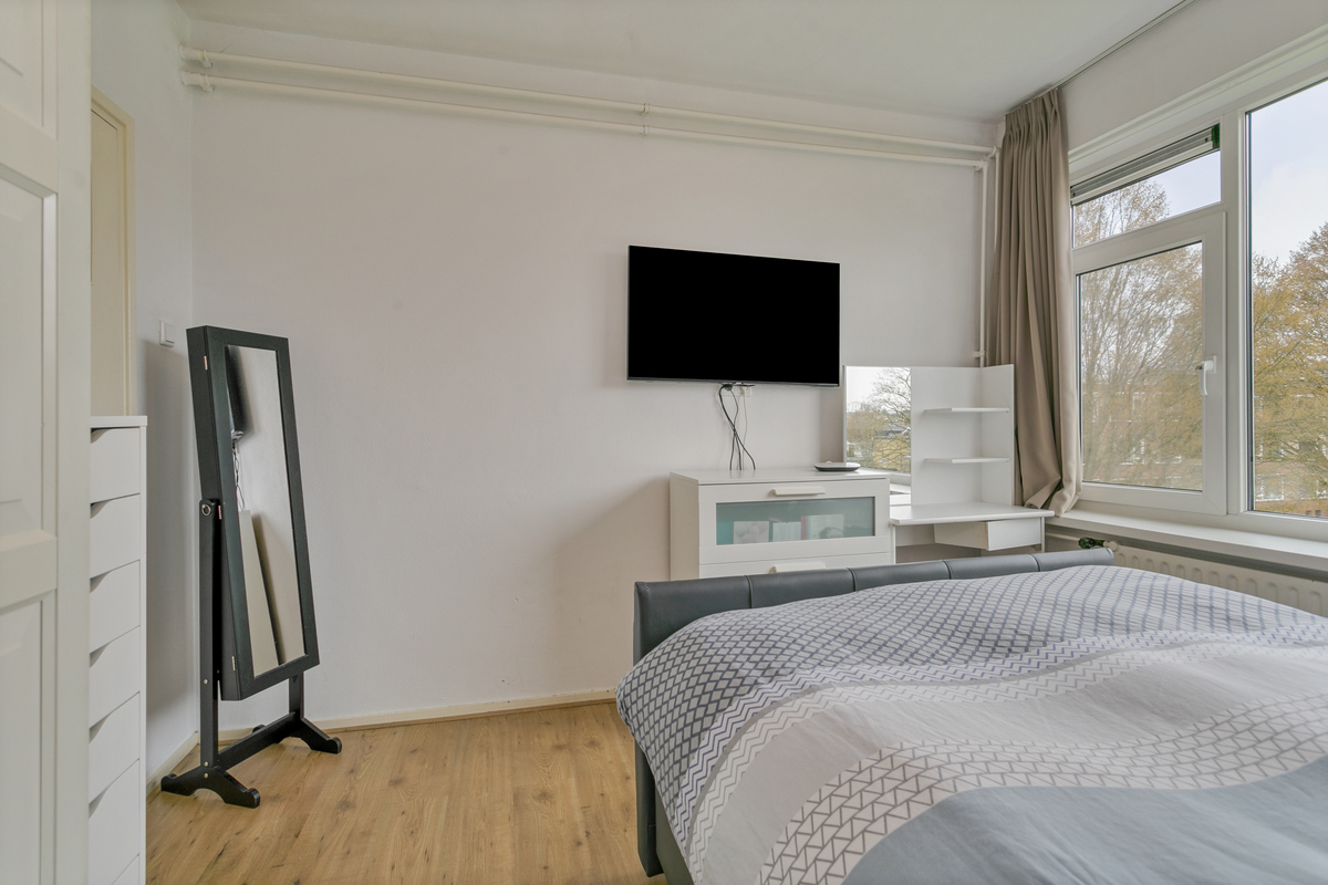 Entree, hal met bergkast en (separaat) toilet ’17. Woonkamer met veel lichtinval middels de grote raampartijen en toegang tot de gesloten keuken. Deze is voorzien van functionele inrichting en wasmachine-aansluiting. Vanuit de keuken is het balkon met vaste kast te bereiken. De twee slaapkamers zijn aan de achterzijde van het appartement gelegen. Tot slot de moderne badkamer ’21 met douche, wastafelmeubel en een kast.