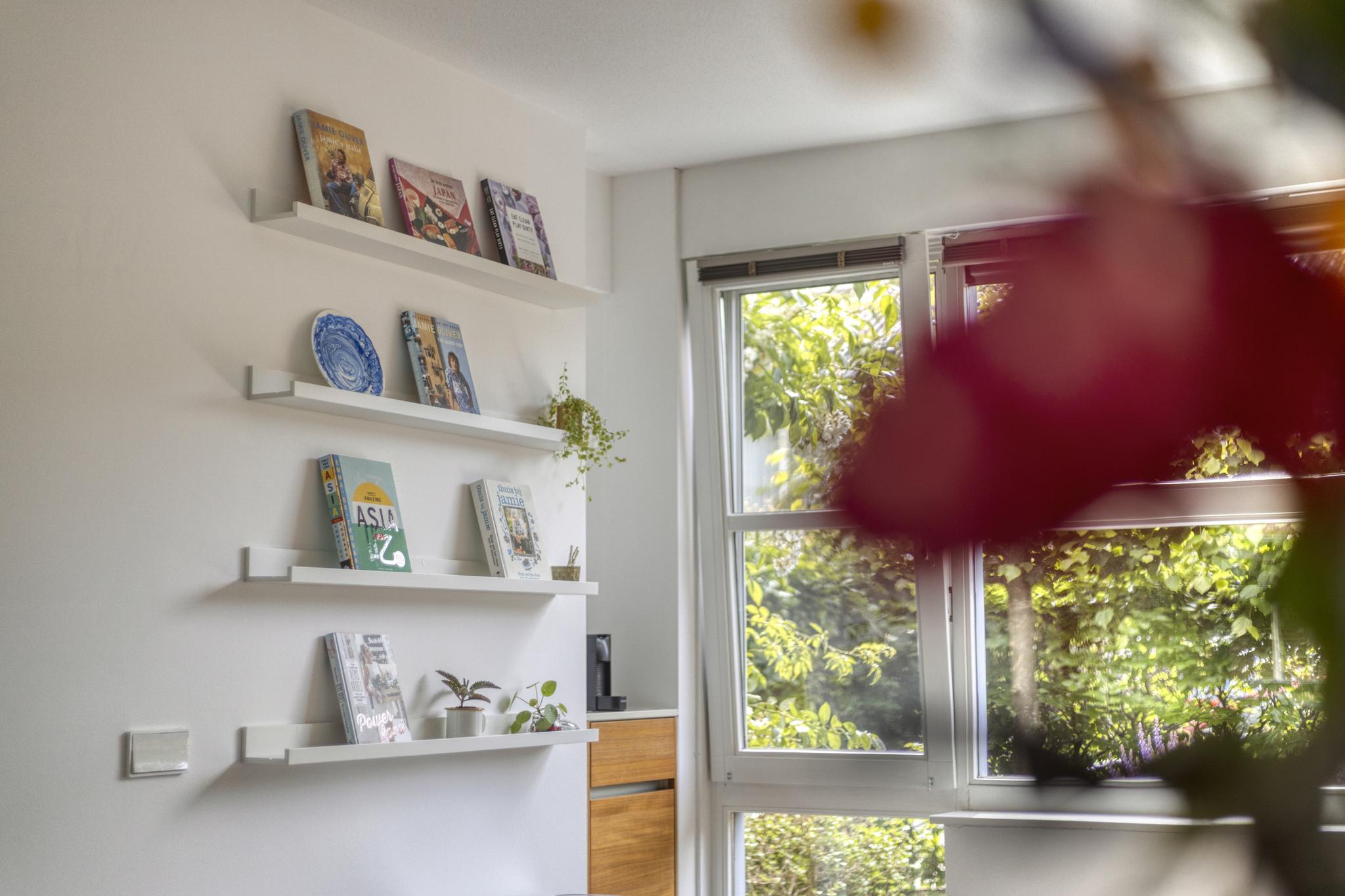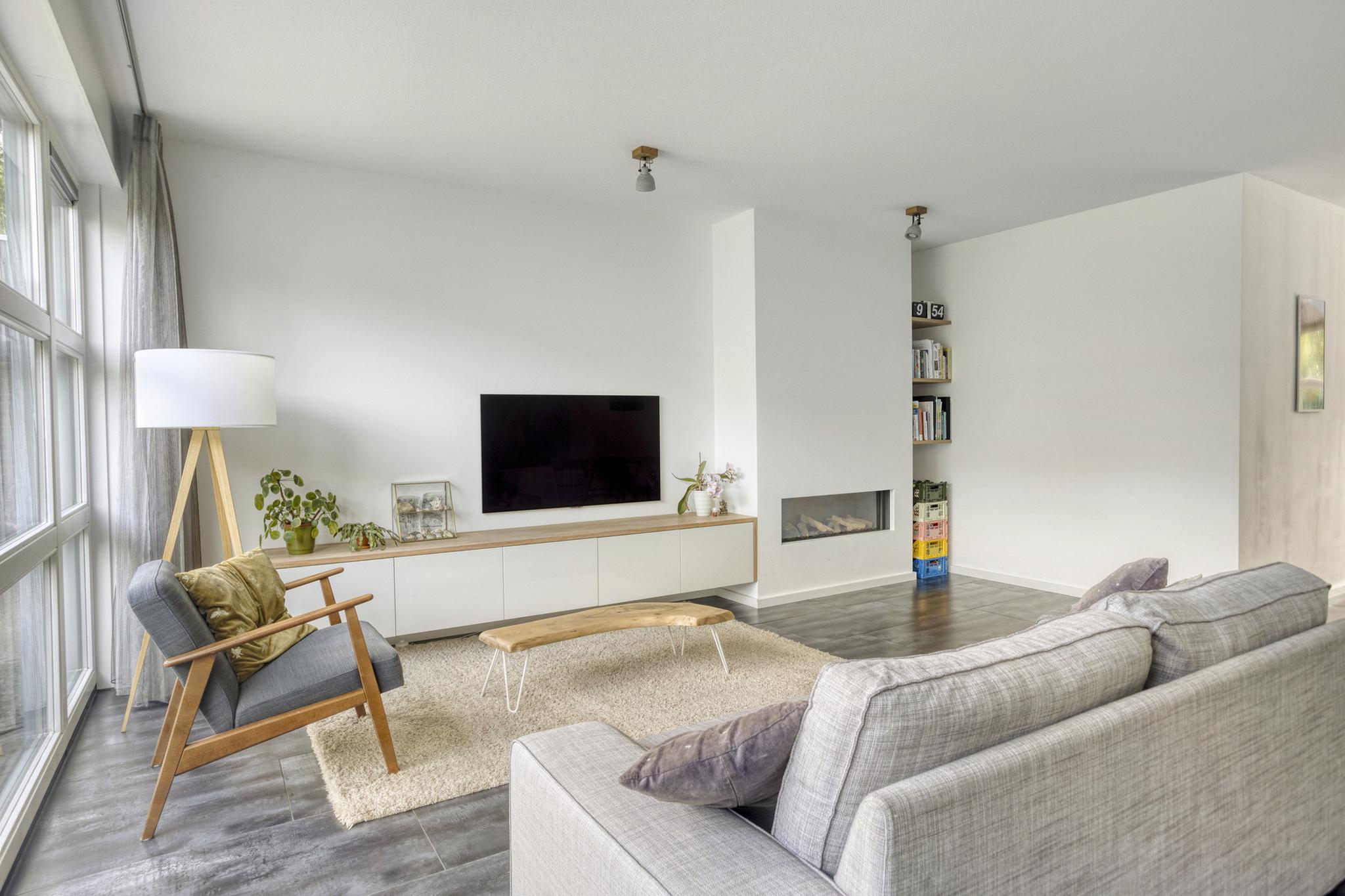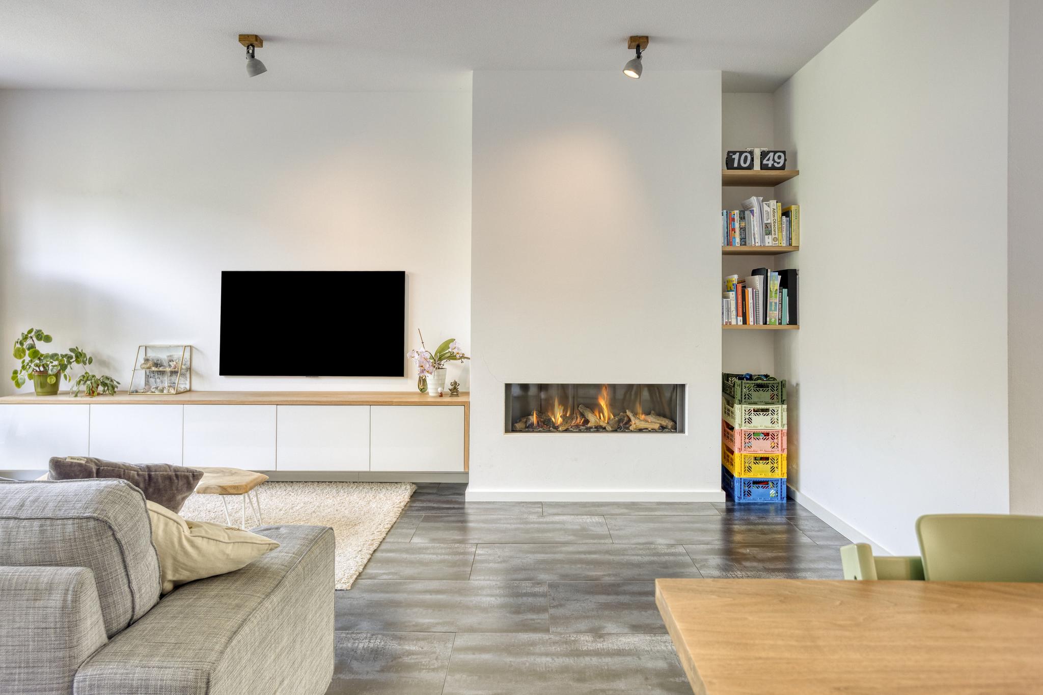 Aansluitend bevindt zich de sfeervolle woonkamer met op maat gemaakt wandmeubel, een gezellige gashaard en openslaande deuren naar de tuin.