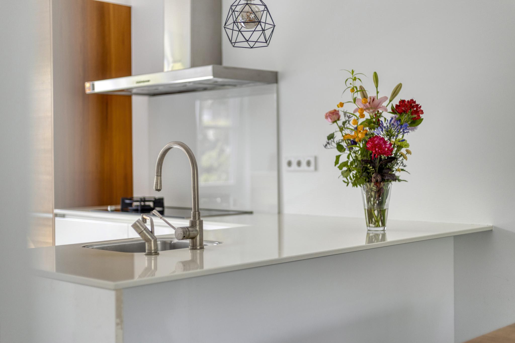 De luxe designkeuken beschikt over een kookeiland met quooker, een 4-pits inductiekookplaat met aparte gaswokbrander, een RVS-afzuigkap, combi-oven/magnetron, koelkast/vriezer en een vaatwasser (vernieuwd in 2025).