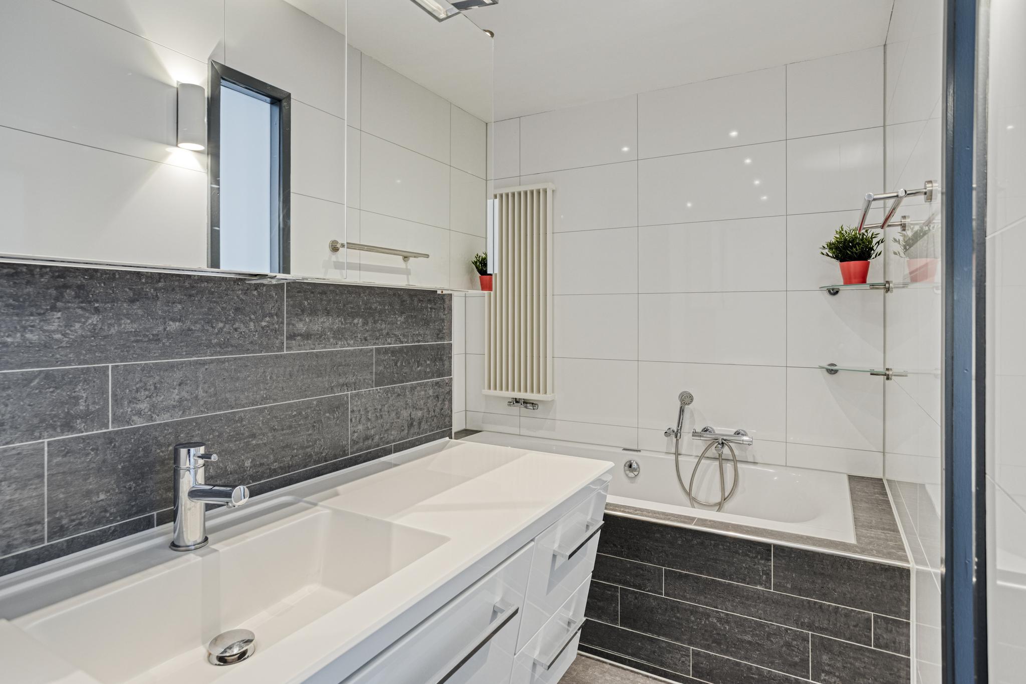 De stijlvolle badkamer beschikt over een bubbelbad, inloopdouche, toilet, dubbele wastafel, designradiator en comfortabele vloerverwarming.