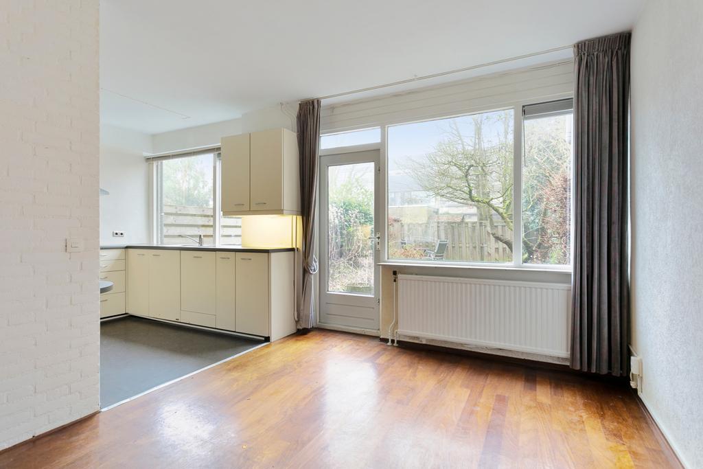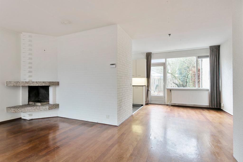 Entree, hal met toilet met fonteintje, ruime woonkamer met een pakketvloer en een openhaard, open leefkeuken met toegang naar de achtertuin (met achterom). De open keuken is geplaatst in een hoekopstelling en is voorzien van diverse inbouwapparatuur en een eettafel.