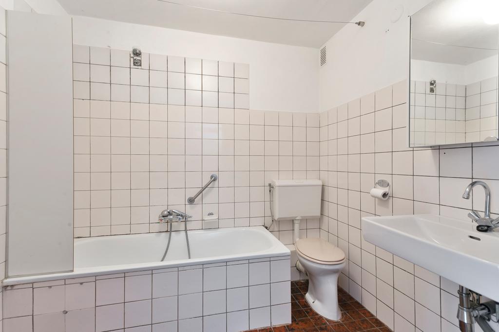 Overloop met cv-kast, 3 slaapkamers (voorheen 4) van goed formaat, eenvoudige badkamer met ligbad, toilet, vaste wastafel en wasmachine aansluiting.